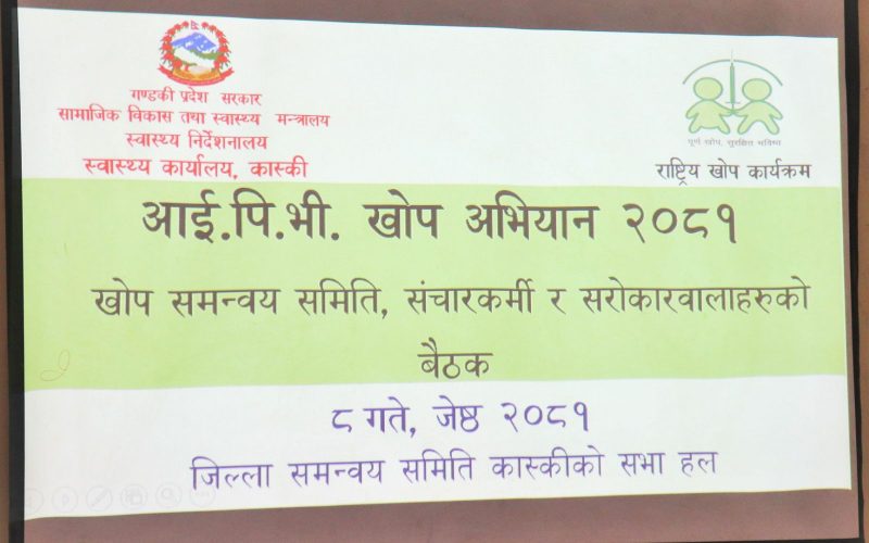 कार्यक्रममा जिल्ला समन्वय अधिकारी नवराज बराल र शिक्षा विकास तथा समन्वय इकाई कास्की प्रमुख लोकनाथ आचार्य खोप अभियानको तयारीबारे प्रकाश पारे । २०३६/०३७ बाट मुखबाट पोलियो खुवाउने कार्यक्रम सुरुवात भएको हो । नेपाल सन २०१० देखि पोलियो मुक्त (शून्य) देश भएको छ ।