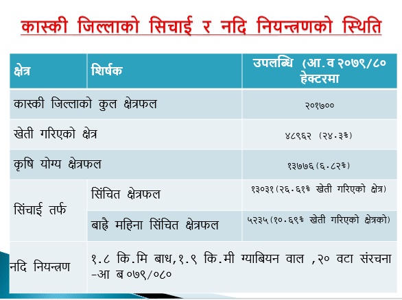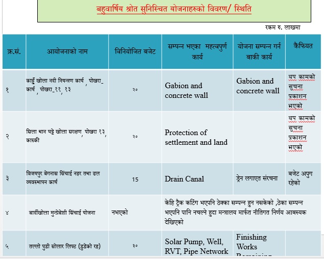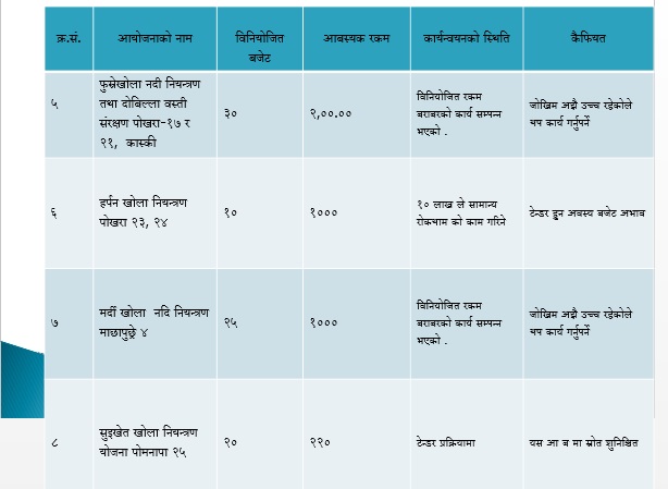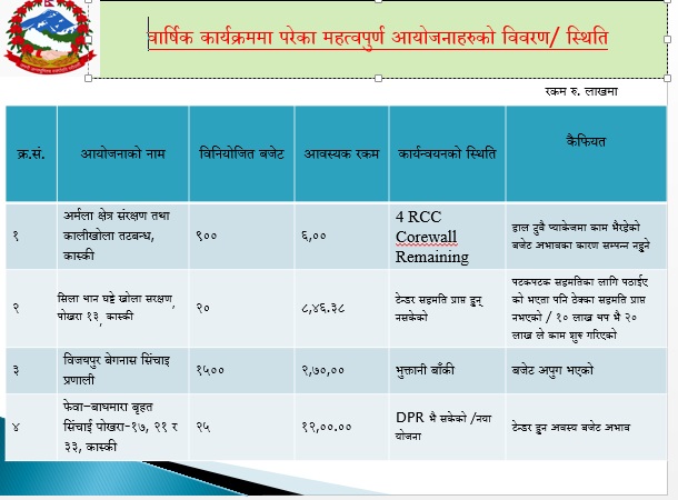 कास्की जिल्ला बाढीपहिरोको जोखिम भएको र सिंचाईको पनि टारहरु भएको जिल्ला हो जिल्लामा निर्माण गर्नुपर्ने आयोजनाहरु ठुला छन् । तर गत वर्षबाट वजेट घटेर आएपछि आयोजना सम्पन्न गर्न कार्यालयलाई समस्या परेको छ ।