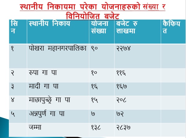 कार्यालयका डिभिजन प्रमुख रमेशराज शर्माले चालु आर्थिक वर्षमा १४१ वटा आयोजनाको लागि २८ करोड ८३ लाख रुपैयाँ वजेट विनियोजन भएकोमा १०० वटा आयोजना सम्पन्न भएको र अन्य आयोजनाहरु निर्माण भईरहेको बताए ।