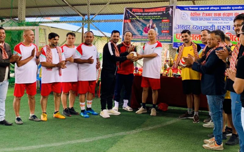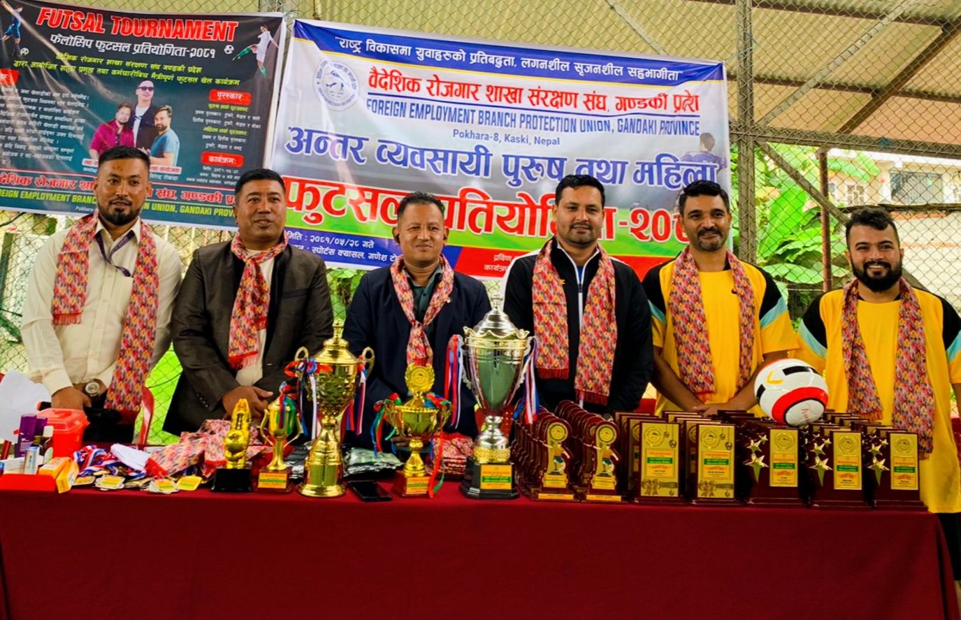 पोखरा । वैदेशिक रोजगार शाखा संरक्षण संघ गण्डकीको आयोजनामा भएको फेलोसिप फुटसल प्रतियोगितामा पोखरा थन्र्डस प्रथम भएको छ । १० टिमको सहभागिता रहेको प्रतियोगिताको फाइनलमा पोखरा थन्डर्सले एसबि गाइजलाई १–० गोल अन्तरले पराजित गरि उपाधी जितेको हो ।