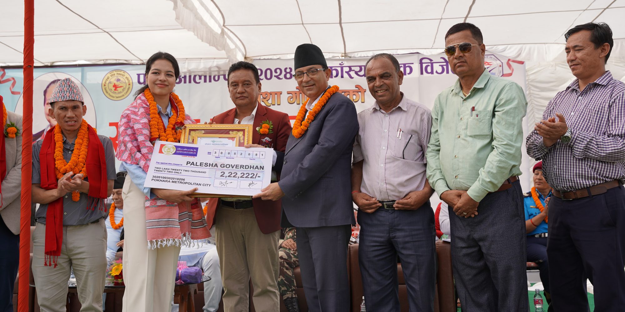 पेरिस प्यारालिम्पिक २०२४ मा नेपाललाई ऐतिहासिक पदक दिलाएकी तेक्वान्दो खेलाडी पलेसा गोवर्धनलाई पोखरा महानगरपालिकाले नगद सहित सम्मान गरेको छ। पेरिस ओलम्पिकमा नेपाललाई ऐतिहासिक कांस्य पदक दिलाउन सफल खेलाडी गोवर्धनलाई नगर प्रमुख धनराज आचार्यले आइतबार नगद रु.२ लाख २२ हजार २२२ सहित सम्मान पत्रले सम्मान गरेका हुन् । पोखरा रङ्गशालामा आयोजित एक कार्यक्रमका बिच पलेसालाई सो सम्मान प्रदान गरिएको हो।