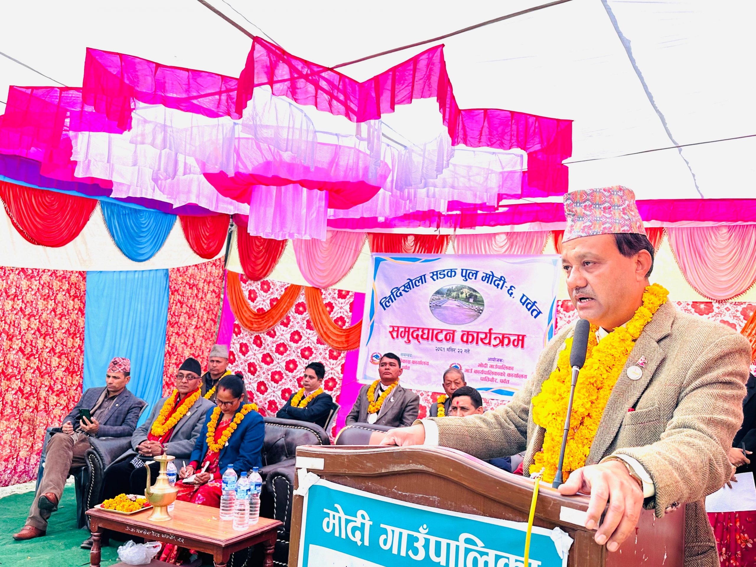 मोदी गाउँपालिका अध्यक्ष हिरादेवी शर्माको अध्यक्षतामा भएको उद्घाटन कार्यक्रममा मन्त्रालयको योजना अनुगमन मूल्यांकन तथा पूर्वाधार महाशाखा प्रमुख डा. महेन्द्र बानिया, नेकपा एमाले पर्वतका अध्यक्ष गोविन्द पहाडी, पूर्वाधार विकास कार्यालय पर्वतका प्रमुख सन्तोष अर्याललगायतले बोलेका थिए ।