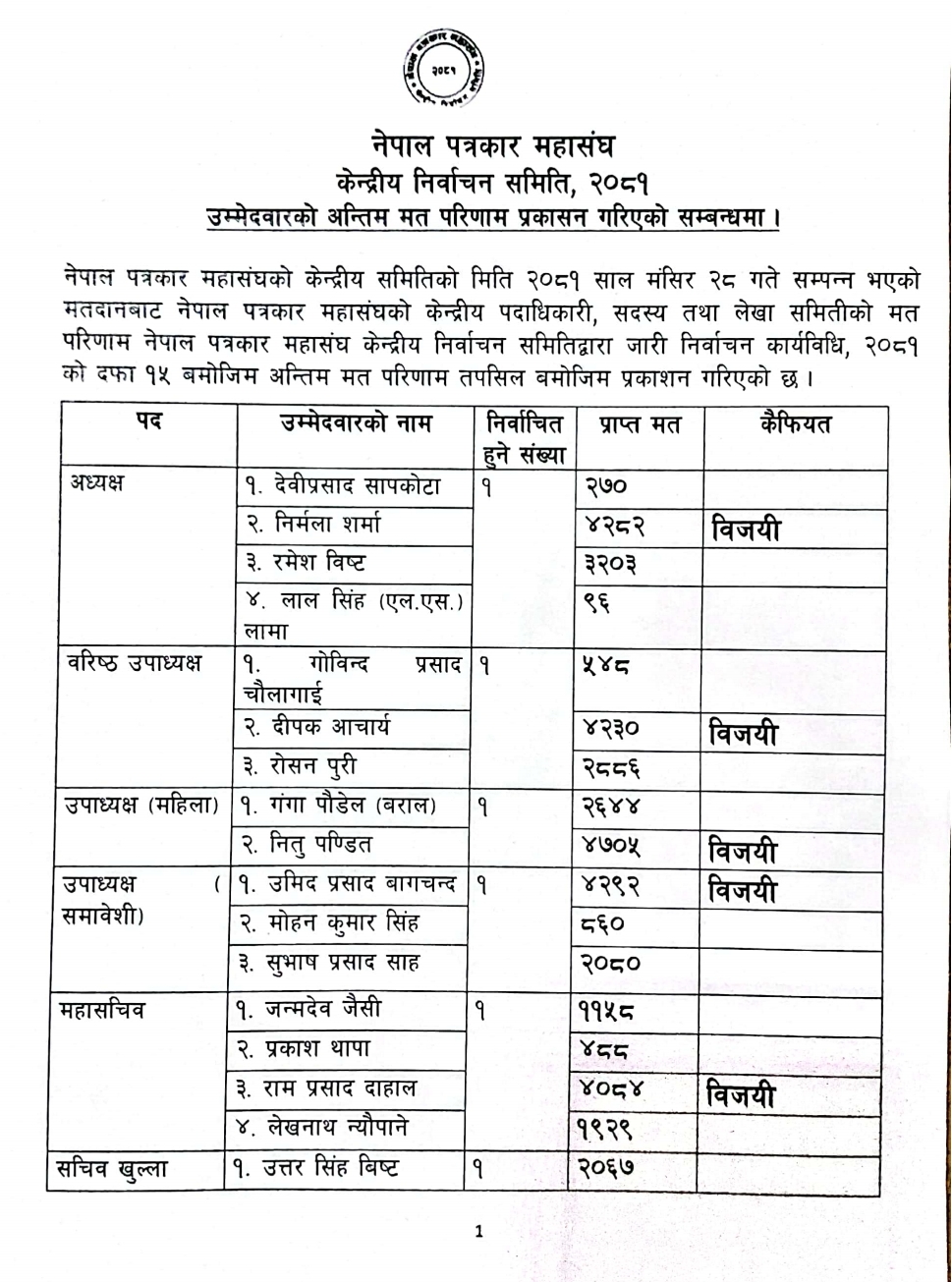 सचिव (खुल्ला) पदमा रमेश खतिवडाले ३४०० मत प्राप्त गरेर विजय प्राप्त गरे। अन्य उम्मेदवारहरूले उत्तर सिंह बिष्ट २०६७ मत, कुमार ओझा ७७५ मत, बाल कृष्ण अधिकारी ३१६ मत र माधव दुलाल ७१९ मत प्राप्त गरे।