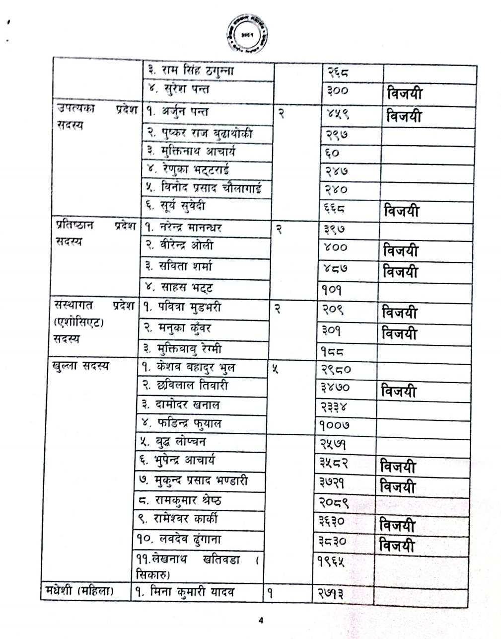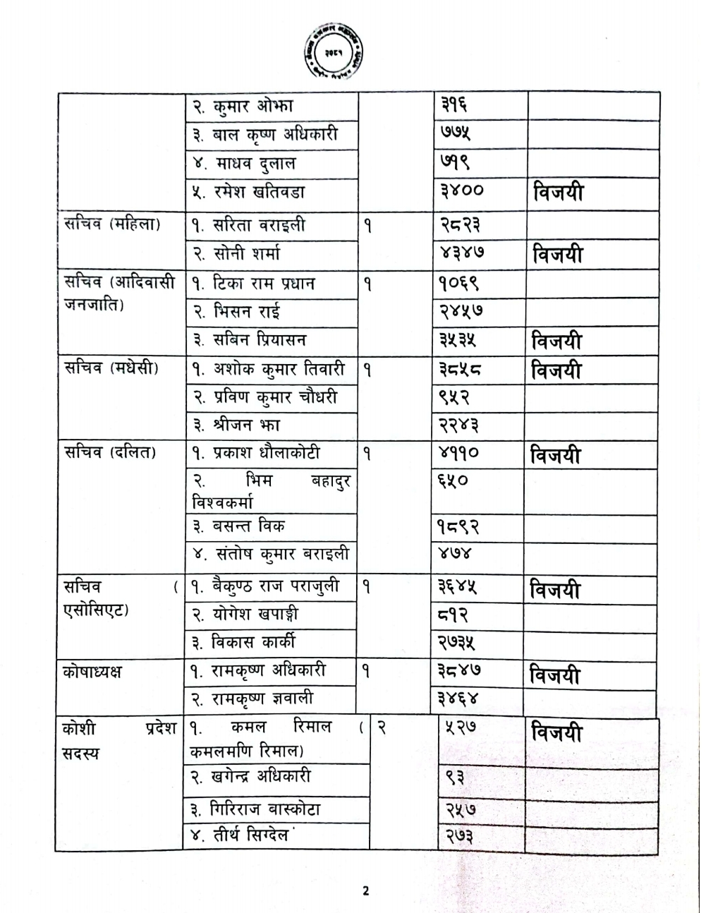 सचिव (महिला) पदमा सोनी शर्मा ४३४७ मत प्राप्त गरेर विजयी भइन्।