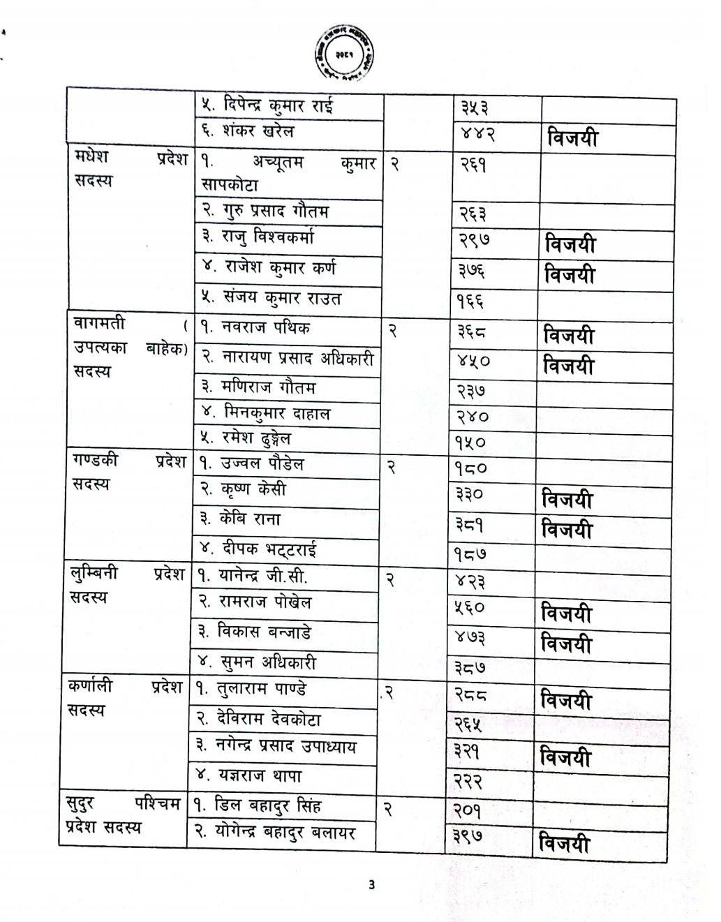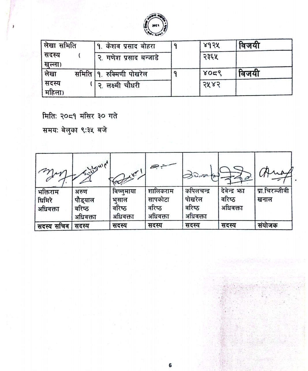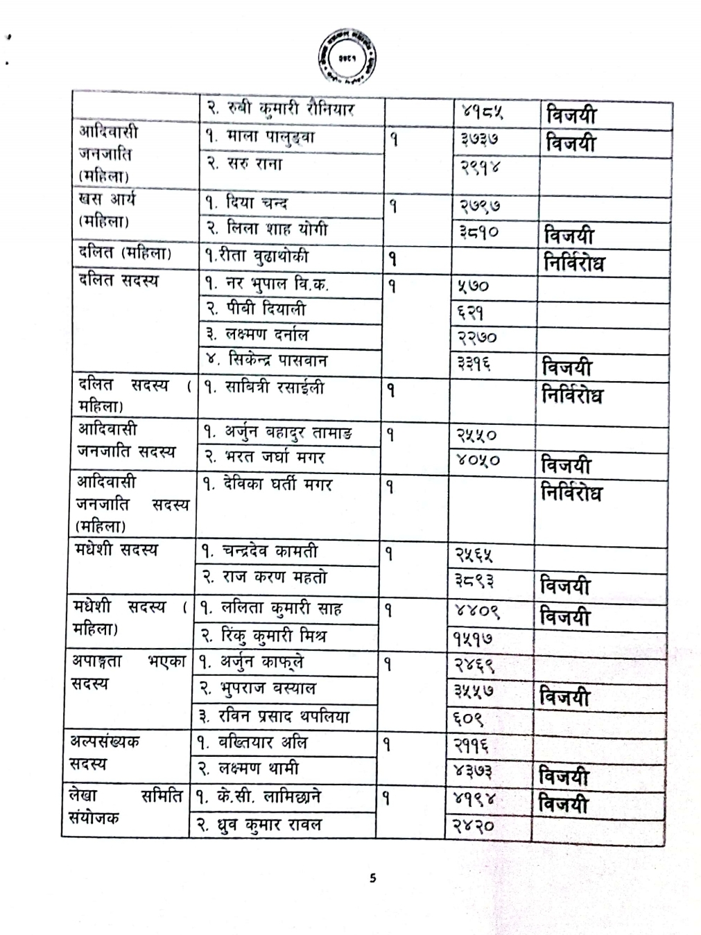 लेखा समिति सदस्य (खुल्ला) पदमा केशव प्रसाद बोहराले ४१२५ मत र गणेश प्रसाद बन्जाडेले २३६५ मत प्राप्त गरेका छन्। लेखा समिति सदस्य महिला पदमा रुक्मिणी पोखरेलले ४०८९ मत र लक्ष्मी चौधरीले २५४२ मत प्राप्त गरे।