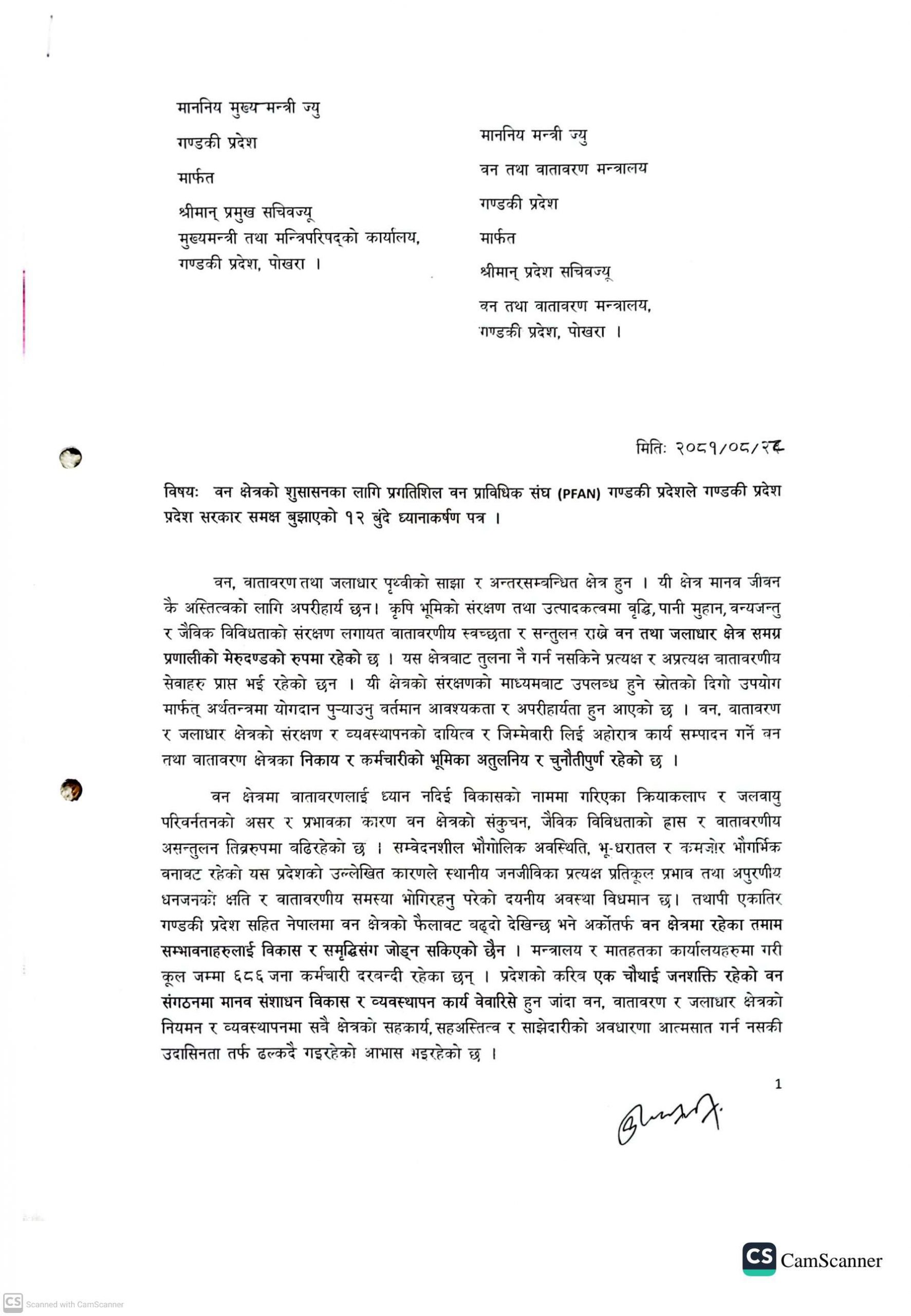 पिफान गण्डकीका अध्यक्ष रुक्मांगत सुवेदीको नेतृत्वमा बुझाएको ध्यानाकर्षण पत्रमा वन क्षेत्रमा वातावरणलाई ध्यान नदिई विकासको नाममा गरिएका क्रियाकलाप र जलवायु परिवर्नतनको असर र प्रभावका कारण वन क्षेत्रको संकुचन, जैविक विविधताको ह्रास र वातावरणीय असन्तुलन तिव्र रुपमा बढिरहेको प्रति चिन्ता व्यक्त गरेको छ ।