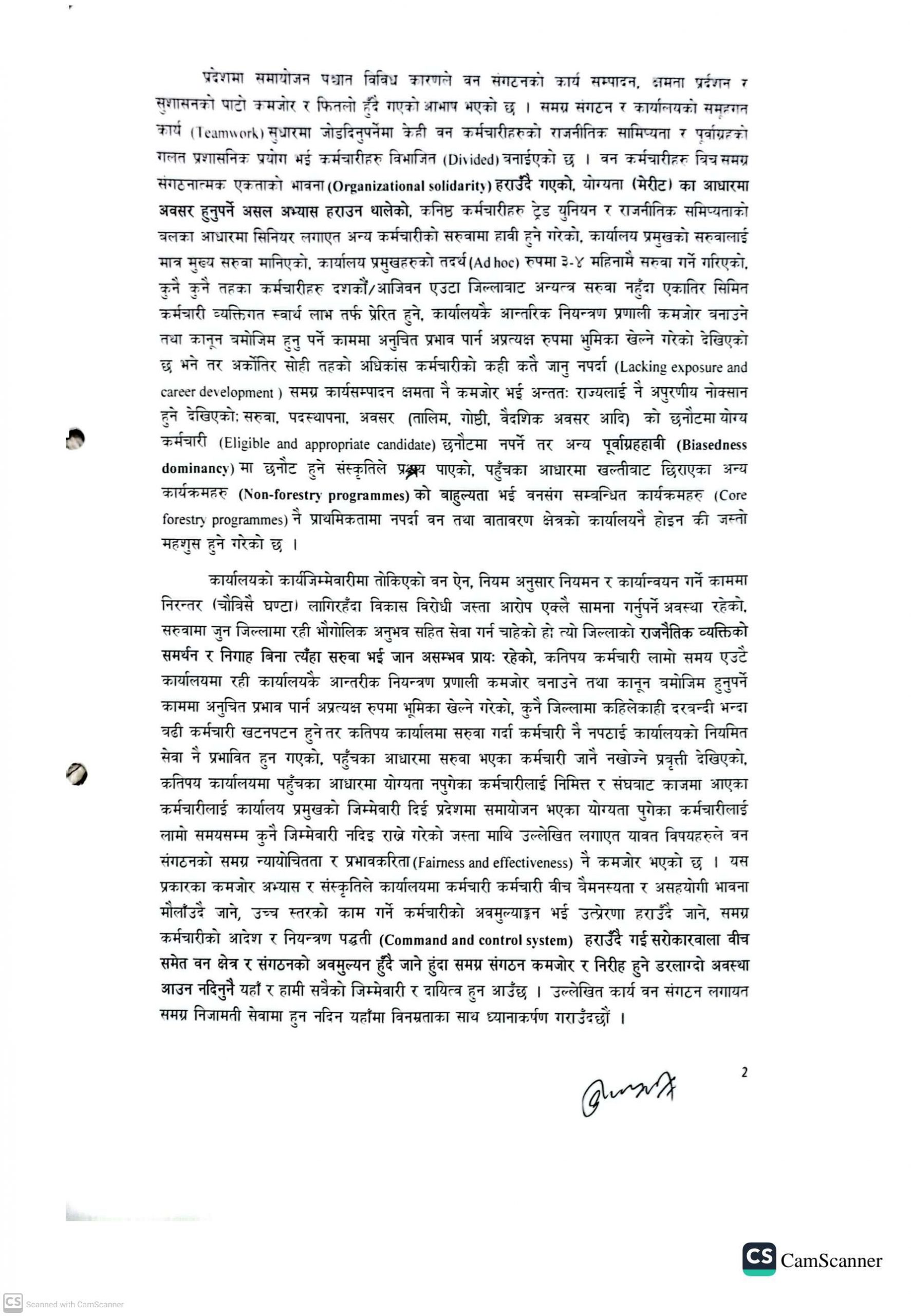 यस प्रकारका कमजोर अभ्यास र संस्कृतिले कार्यालयमा कर्मचारी कर्मचारी वीच बैमनस्यता र असहयोगी भावना मौलाँउदै जाने, उच्च स्तरको काम गर्ने कर्मचारीको अवमुल्याङ्कन भई उत्प्रेरणा हराउँदै जाने, समग्र कर्मचारीको आदेश र नियन्त्रण पद्धती (Command and control system) हराउँदै गई सरोकारवाला वीच समेत वन क्षेत्र र संगठनको अवमुल्यन हुँदै जाने हुंदा समग्र संगठन कमजोर र निरीह हुने डरलाग्दो अवस्था आउन नदिनुनै यहाँ र हामी सबैको जिम्मेवारी र दायित्व हुन आउँछ । उल्लेखित कार्य वन संगठन लगायत समग्र निजामती सेवामा हुन नदिन यहाँमा विनम्रताका साथ ध्यानाकर्षण गराउँदछौं भनिएको छ ।