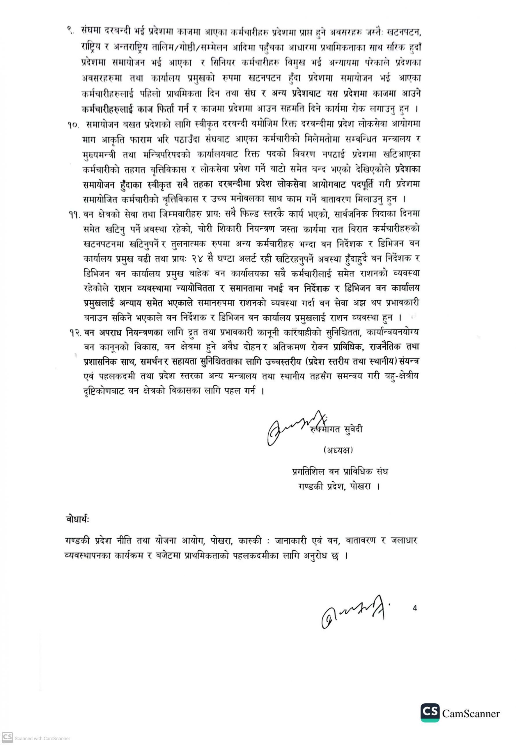 पिफान गण्डकीले मुख्यमन्त्री र वन तथा वातावरणमन्त्रीलाई प्रमुख सचिव र सचिवमार्फत बुझाएको १२ बुंदे ध्यानाकर्षणपत्रमा भनिएको छ : प्रदेशमा समायोजन पश्चात विविध कारणले वन संगठनको कार्य सम्पादन, क्षमता प्रर्दशन र सुशासनको पाटो कमजोर र फितलो हुँदै गएको आभाष भएको, समग्र संगठन र कार्यालयको समूहगत कार्य (Teamwork) सुधारमा जोडदिनुपर्नेमा केही वन कर्मचारीहरुको राजनीतिक सामिप्यता र पूर्वाग्रहको गलत प्रशासनिक प्रयोग भई कर्मचारीहरु विभाजित (Divided) बनाईएको, वन कर्मचारीहरु बिच समग्र संगठनात्मक एकताको भावना (Organizational solidarity) हराउँदै गएको, योग्यता (मेरीट) का आधारमा अवसर हुनुपर्ने असल अभ्यास हराउन थालेको, कनिष्ठ कर्मचारीहरु ट्रेड युनियन र राजनीतिक समिप्यताको बलका आधारमा सिनियर लगाएत अन्य कर्मचारीको सरुवामा हावी हुने गरेको, कार्यालय प्रमुखको सरुवालाई मात्र मुख्य सरुवा मानिएको, कार्यालय प्रमुखहरुको तदर्थ (Ad hoc) रुपमा ३–४ महिनामै सरुवा गर्ने गरिएको, कुनै कुनै तहका कर्मचारीहरु दशकौँ/आजिवन एउटा जिल्लाबाट अन्यत्त्र सरुवा नहुँदा एकातिर सिमित कर्मचारी व्यक्तिगत स्वार्थ लाभ तर्फ प्रेरित हुने, कार्यालयकै आन्तरिक नियन्त्रण प्रणाली कमजोर बनाउने तथा कानून बमोजिम हुनु पर्ने काममा अनुचित प्रभाव पार्न अप्रत्यक्ष रुपमा भुमिका खेल्ने गरेको देखिएको छ भने तर अर्कोतिर सोही तहको अधिकांश कर्मचारीको कही कतै जानु नपर्दा (Lacking exposure and career development ) समग्र कार्यसम्पादन क्षमता नै कमजोर भई अन्ततः राज्यलाई नै अपुरणीय नोक्सान हुने देखिएको; सरुवा, पदस्थापना, अवसर (तालिम, गोष्ठी, वैदशिक अवसर आदि) को छनौटमा योग्य कर्मचारी (Eligible and appropriate candidate) छनौटमा नपर्ने तर अन्य पूर्वाग्रहहावी (Biasedness dominancy) मा छनौट हुने संस्कृतिले प्रक्षय पाएको, पहुँचका आधारमा खल्तीबाट छिराएका अन्य कार्यक्रमहरु (Non–forestry programmes) को बाहुल्यता भई वनसंग सम्बन्धित कार्यक्रमहरु (Core forestry programmes) नै प्राथमिकतामा नपर्दा वन तथा वातावरण क्षेत्रको कार्यालयनै होइन की जस्तो महशुस हुने गरेको छ ।