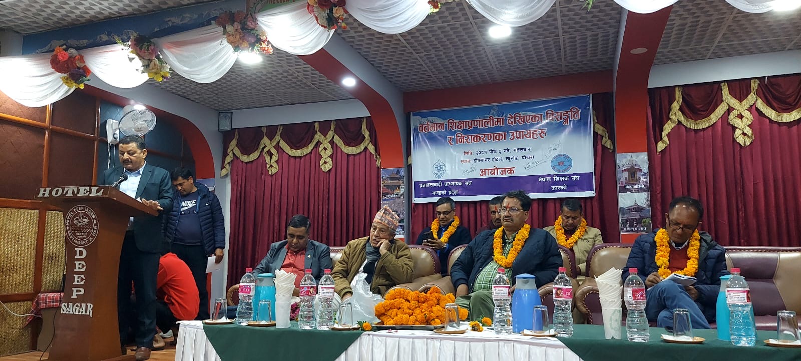 पोखरामा प्रजातन्त्रवादी प्राध्यापक संघ गण्डकी प्रदेश र नेपाल शिक्षक संघ कास्कीको संयुक्त आयोजनामा आयोजित वर्तमान शिक्षा प्रणालीमा देखिएका विसङ्गति र निराकरणका उपायहरु सम्बन्धित अन्र्तक्रियामा सहभागि विज्ञहरुले सो सुझाव दिएका हुन् ।