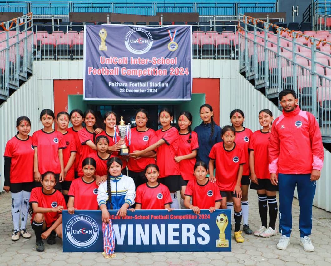 पोखरा । युनाईटेड कम्युनिटी नेपाल (युनिकन)ले शनिबार पोखरा रंगशालामा आयोजना गरेको “युनिकन अन्तर विद्यालय फुटबल प्रतियोगिता २०२४” मा छात्रा तर्फ अमरसिंह मावि प्रथम भएको छ भने छात्र तर्फ बाराही मावि प्रथम भएको छ ।
