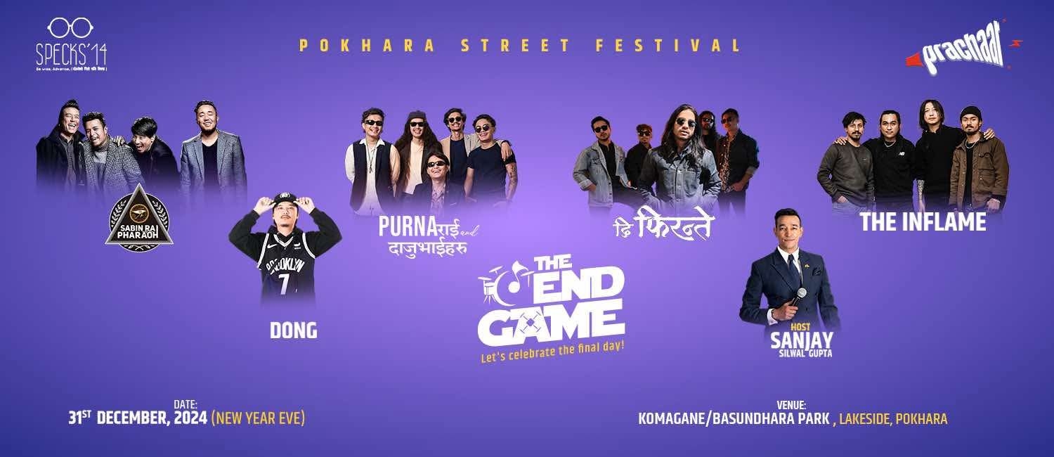 पोखरा । पोखरामा अंग्रेजी नयाँ वर्षको सन्दर्भमा हुने नेपालको सबैभन्दा ठूलो सडक महोत्सवमा एकैदिन पाँच जना चर्चित कलाकार र उनीहरुको ब्याण्डले प्रस्तुति दिने भएका छन् । ‘द इण्ड गेम’ नाम दिएर अंग्रेजी नयाँ वर्ष २०२५ लाई स्वागत गर्न लेकसाइडको बसुन्धरा पार्क/कोमागाने पार्कमा डिसेम्बर ३१ (पुस १६)मा कार्यक्रम हुन लागेको हो । प्रचार नेपाल र स्पेक्स–१४ को आयोजना र आर्बिटरी इभेन्टससँगको सहकार्यमा कार्यक्रम हुने भएको हो ।
