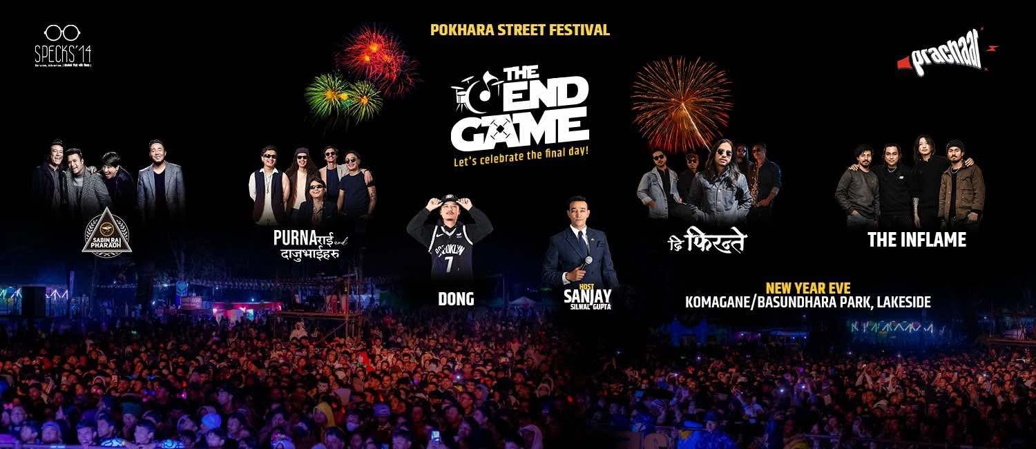 ‘द इण्ड गेम’ मा सबिन राई एण्ड फेरोह, पूर्ण राई र दाजु–भाइहरु, ¥यापर डोङ, देवेन्द्र बब्लु एण्ड द फिरन्ती, द इन्फ्लेम ब्यान्डजस्ता चर्चित ब्याण्ड र कलाकारहरुको प्रस्तुति रहने आयोजक प्रचार नेपालका सञ्चालक आशिष पुरीले जानकारी दिए । चर्चित पोडकास्ट सञ्चालक सञ्जय सिलवाल गुप्ताले यो कार्यक्रम सञ्चालन गर्ने छन् । डिसेम्बर ३१ मा हुने कार्यक्रम संगीत र मनोरन्जन प्रेमीहरूका लागि अविस्मरणीय अनुभव बन्ने स्पेक्स–१४ का सञ्चालक महेश्वरसिंह भण्डारीले बताए ।