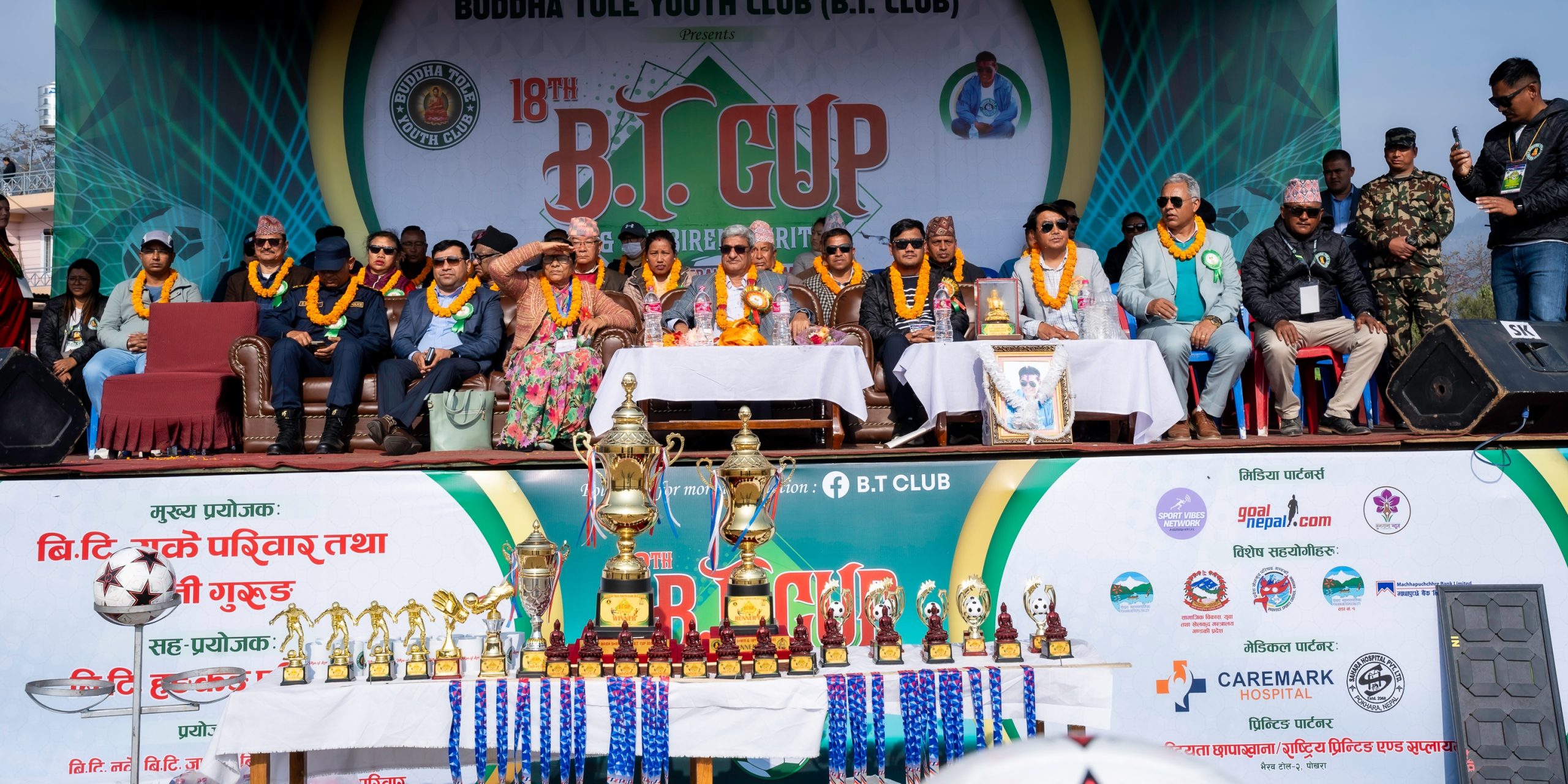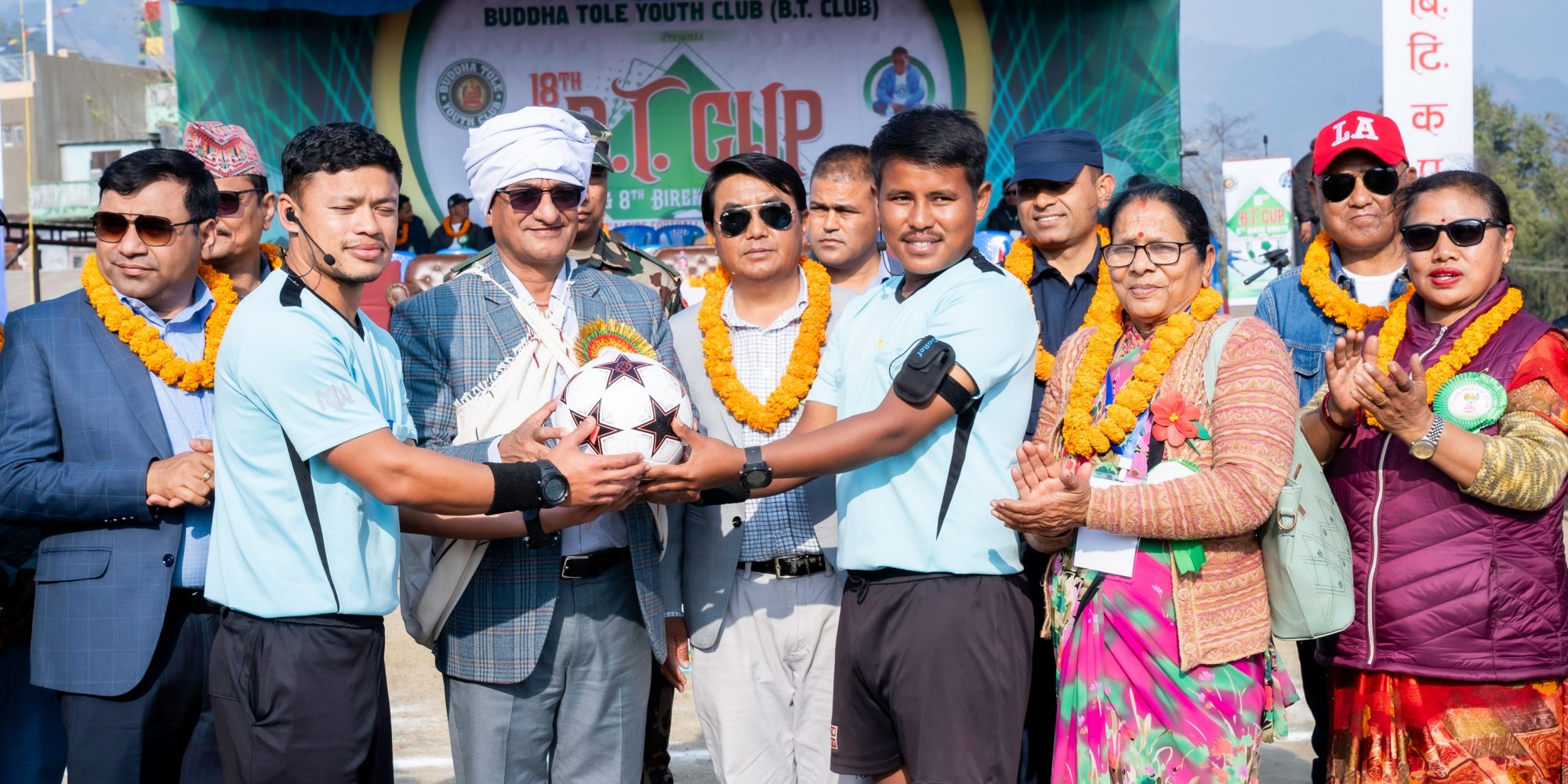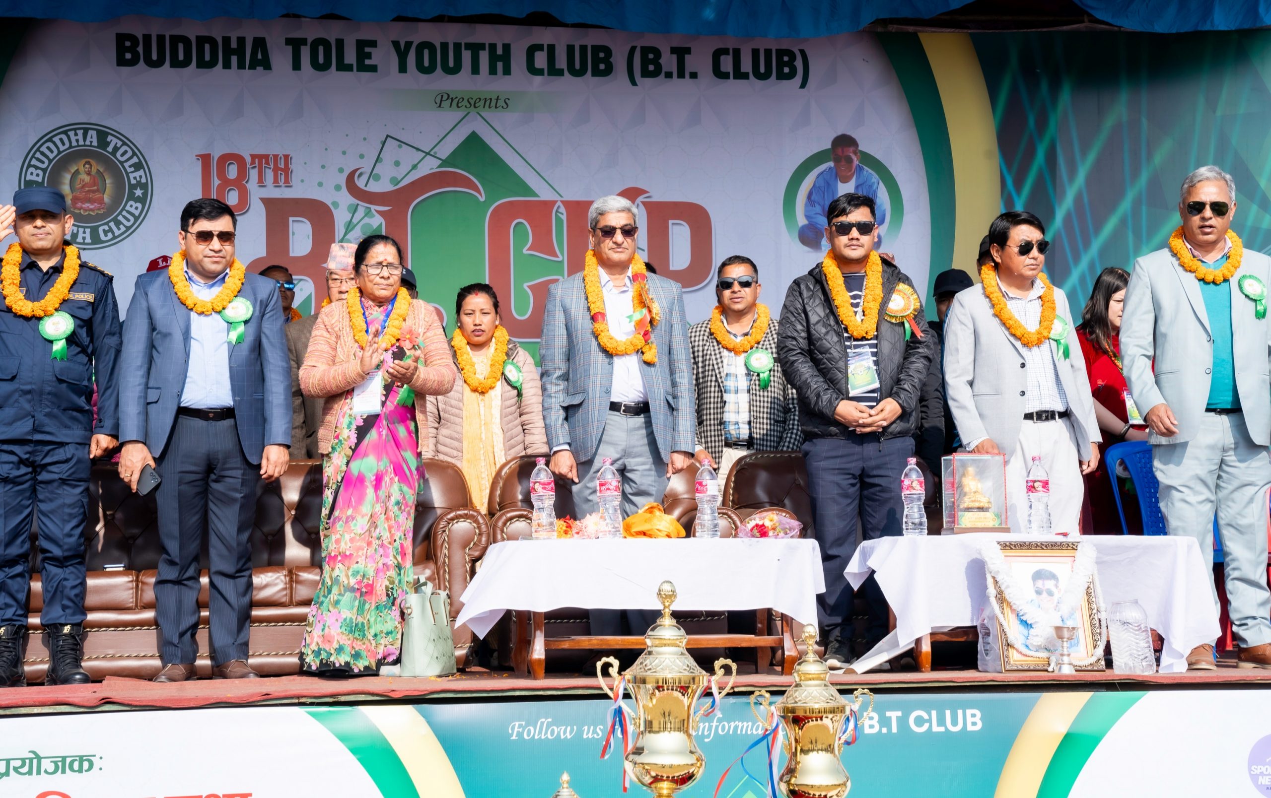 पोखरा । पोखरामा मंगलबारदेखि आठौं वीरेन स्मृति र १८ औं बिटी कप सेभेन ए साइड फुटबल प्रतियोगिता सुरु भएको छ। ‘हामी एक हौं’ भन्ने नारासहित क्रियाशील बुद्धटोल युवा क्लबको आयोजनामा पोखराको टुँडिखेल मैदानमा सुरु भएको प्रतियोगिताको उद्घाटन गृहमन्त्री रमेश लेखकले गरेका हुन्।