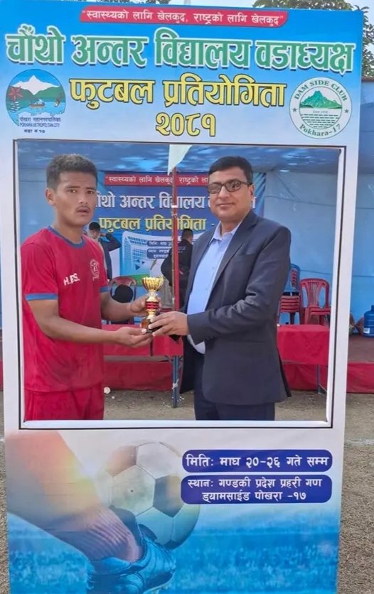 पोखरा । पोखरामा जारी चौथो सस्करणको अन्तरबिद्यालय वडा अध्यक्ष कप फुटबल प्रतियोगिता अब समापनको नजिक पुगेको छ। शनिबार, फेब्रुअरी ८ का दिन, उपाधिका लागि एक शानदार भिडन्त हुनेछ जसमा हिमालयन बोर्डिङ स्कुल र एल.पी. देवकोटा स्कुलले एक आपसमा प्रतिस्पर्धा गर्नेछन्।