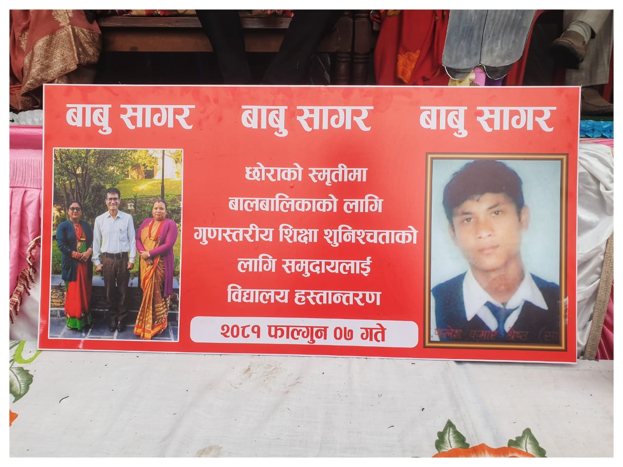 विद्यालयको १४ औ वार्षिकोत्सवको अवसरमा वेद कुमार श्रेष्ठ र उनकी श्रीमती सीतादेवि श्रेष्ठ र सृजना श्रेष्ठको नाममा रहेको सम्पूर्ण सम्पत्ति बाबु सागर स्मृति प्रतिष्ठानमा हस्तान्तरण गरेका हुन् ।