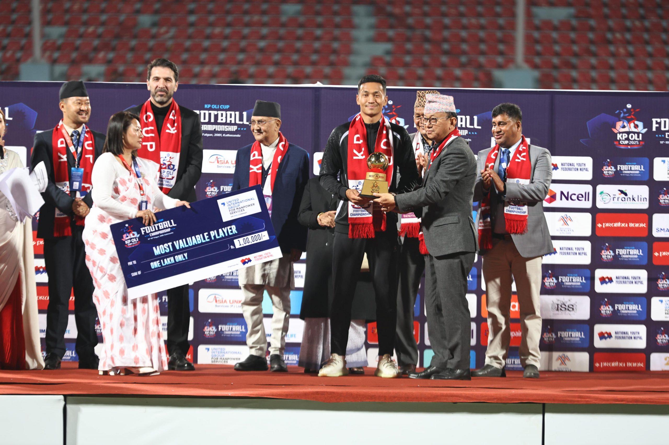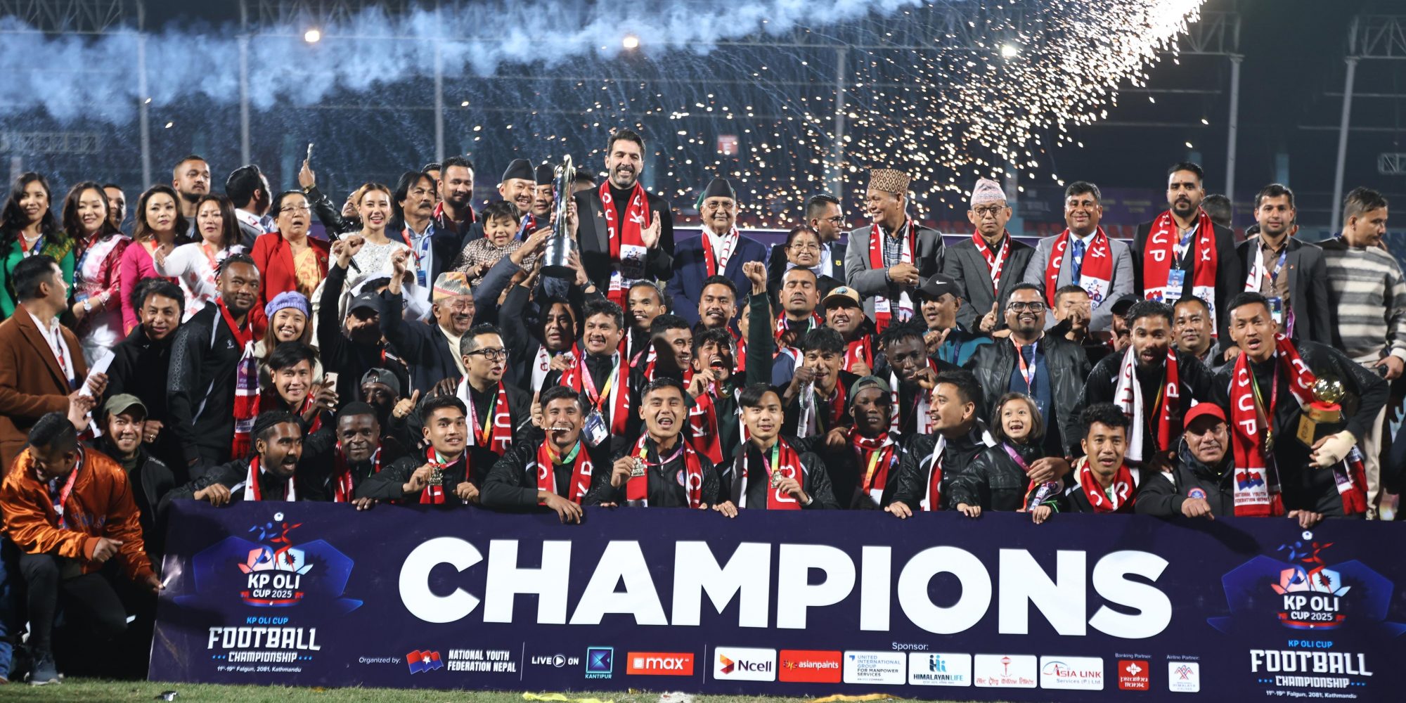 पोखरा । मछिन्द्र एफसीले केपी ओली कप फुटबल प्रतियोगिताको उपाधि तेस्रो पटक जित्दै आफ्नो दबदबा कायम राखेको छ। दशरथ रंगशालामा भएको फाइनल खेलमा त्रिभुवन आर्मी क्लबलाई २–० गोलले पराजित गर्दै मछिन्द्रले ऐतिहासिक सफलता हात पारेको हो।