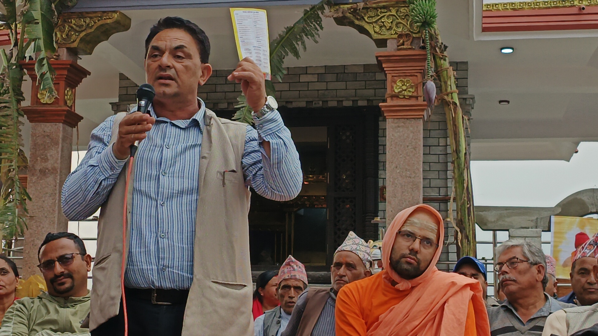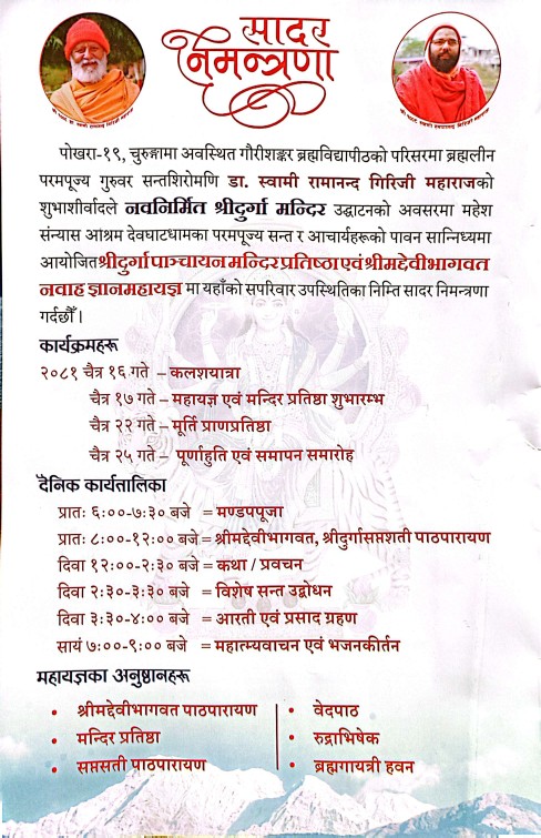 उनका अनुसार प्रत्येक दिन बिहान ६:०० बजे मण्डप पूजा, ८:०० बजे श्रीमद्देवीभागवत एवं श्रीदुर्गासप्तशती पाठपारायण, दिउँसो १२:०० बजे कथा प्रवचन, २:३० बजे विशेष सन्त उद्बोधन, ३:३० बजे आरती एवं प्रसाद वितरण, साँझ ७:०० बजे महात्म्यवाचन तथा भजनकीर्तनको कार्यक्रम हुने जानकारी दिए ।