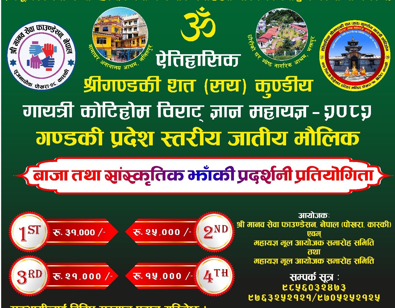 पोखरा । पोखरा महानगरपालिका–१७, बिरौटामा सञ्चालित ऐतिहासिक श्री गण्डकी शत कुण्डीय कोटिहोम विराट् ज्ञान महायज्ञलाई सांस्कृतिक रूपमा थप आकर्षक बनाउँदै आयोजकले गण्डकी प्रदेशस्तरीय सांस्कृतिक झाँकी प्रदर्शनी आयोजना गर्ने भएका छन्।