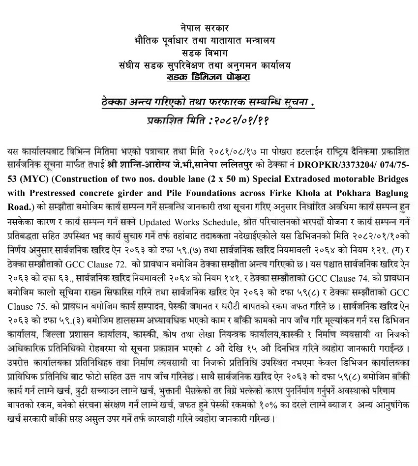सडक डिभिजन कार्यालय पोखराका योजना प्रमुख नवराज बास्तोलाले ठेकेदार कम्पनीले निर्धारित समयमा काम सम्पन्न नगरेको, प्रतिबद्धता र तदारुकता नदेखाएको र सम्पर्कमै नरहेको कारण ठेक्का सम्झौता तोडिएको जानकारी दिए। “पटक–पटक म्याद थप्दा पनि काम भएन, गत मंसिरदेखि नै सम्झौता तोड्ने प्रक्रियामा थियौं,” उनले भने।
