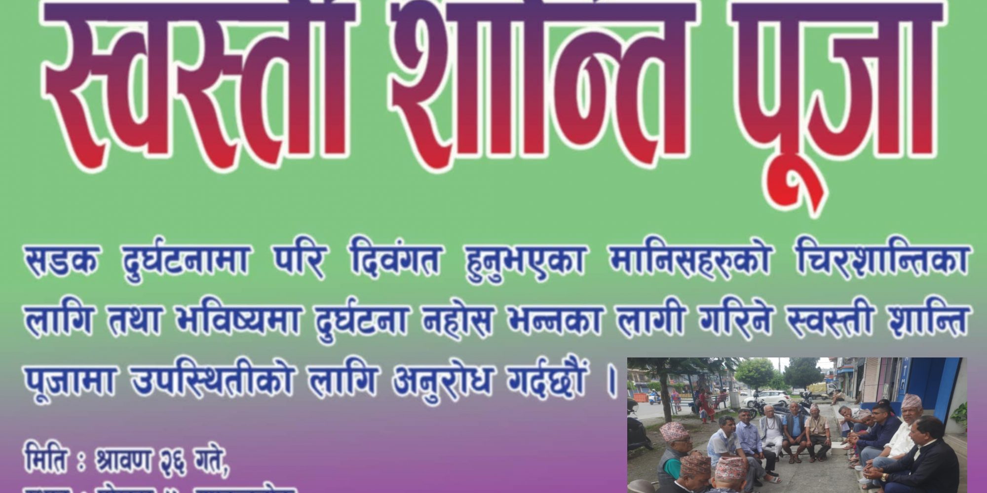 पोखरा । पोखरा महानगरपालिका–५ गणतन्त्रचोक आसपासमा विगतमा भएका सडक दुर्घटनामा परी मृत्यु भएका व्यक्तिहरूको आत्माको चिरशान्तिको कामना गर्दै तथा भविष्यमा यस्ता दुर्घटना नहोस् भन्ने उद्देश्यले आउँदो सोमबार (साउन २६) गणतन्त्रचोकमा स्वस्ती शान्ती पूजा हुने भएको छ।