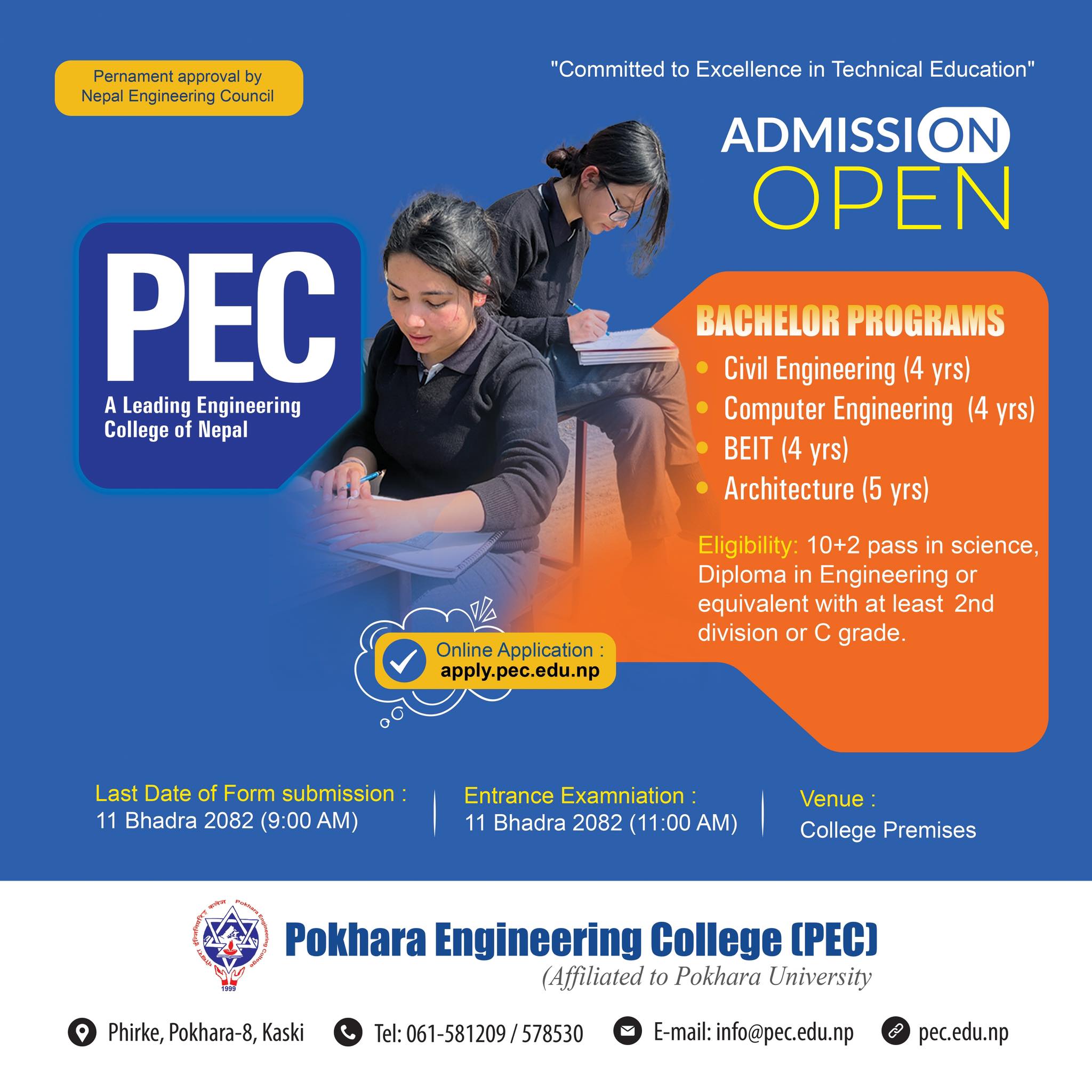 नेपाल इन्जिनियरिङ काउन्सिलबाट ‘A Grade’ को स्थायी मान्यता प्राप्त कलेजले विहान ६ बजेदेखि राति ९ बजेसम्म कक्षा सञ्चालन गरेर विद्यार्थीको आवश्यकतालाई सम्बोधन गर्ने गरेको छ ।