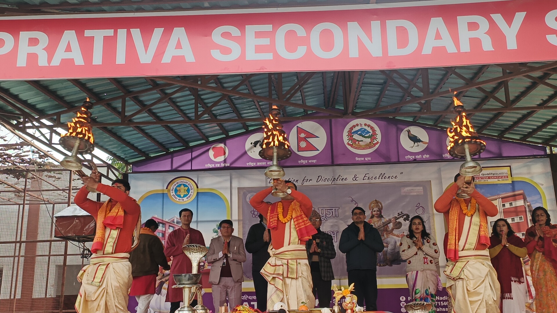 पाेखरा । नदिपुरस्थित प्रतिभा माध्यमिक विद्यालयमा माघ शुक्ल पञ्चमी अर्थात् वसन्त पञ्चमीका अवसरमा सरस्वती पूजा तथा अक्षरारम्भ कार्यक्रम विधिपूर्वक सम्पन्न भएको छ। धार्मिक विधिअनुसार गुरुहरुले मन्त्राेच्चारण गरि सरस्वती पूजा तथा अक्षरारम्भ गरिएकाे कार्यक्रममा महाआरती समेत गरिएकाे थियाे ।