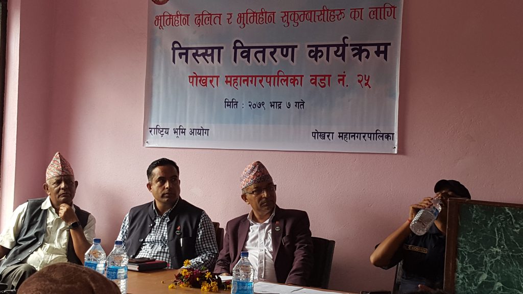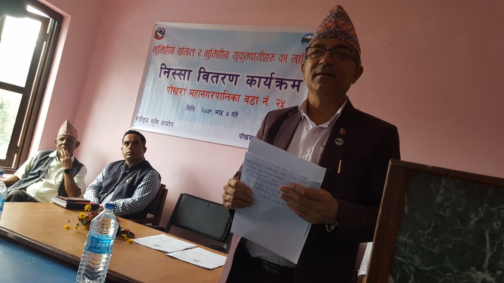 पाेखरा । पाेखरा वडा नम्वर २५ बाट पाेखरा महानगरमै पहिलाे पटक भूमिहीन दलित तथा भूमिहीन सुकुम्वासीहरुका लागि निस्सा वितरण कार्यक्रम शुरु भएकाे छ ।