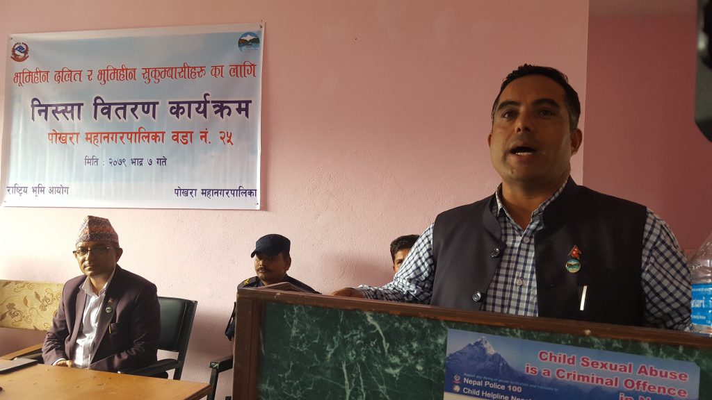पोखरा महानगरपालिका वडा नं. २५ का वडा अध्यक्ष मोतीराज तिम्सिनाले भूमिहीन दलित, भूमिहीन सुकुम्वासीहरुलाई निस्सा वितरणको काम आफ्नै वडाबाट सुरु भएकाेमा खुसी व्यक्त गरे ।