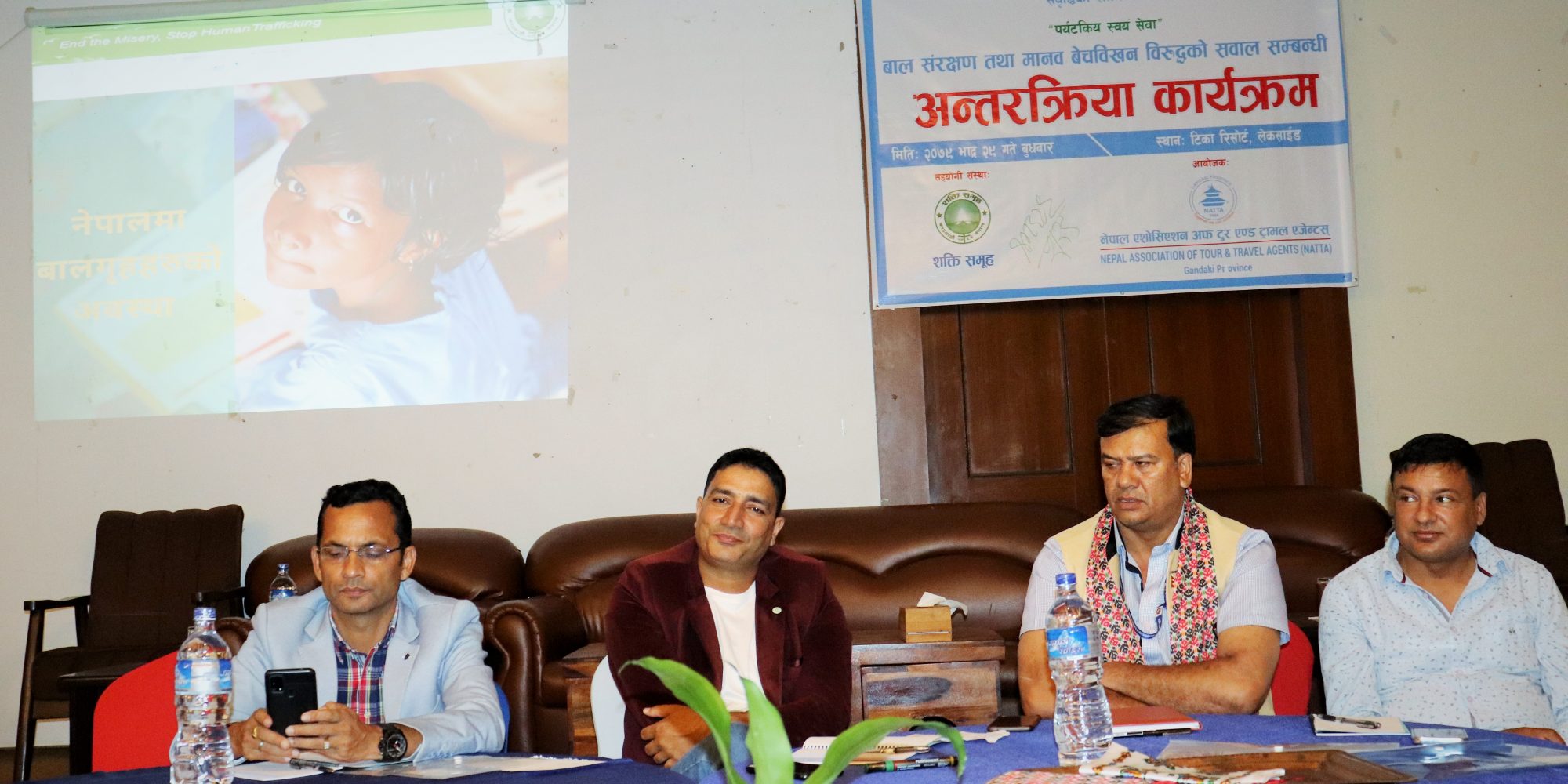 शक्ति समूहकाे प्राेजेक्ट म्यानेजर सरला तामाङले बाल संरक्षण बेचविखनसम्वन्धी कार्यपत्र प्रस्तुत गरेकाे कार्यक्रमकाे स्वागत नाट्टाका प्रथम उपाध्यक्ष किशाेर दाहाललेे गरेका थिए भने सञ्चालन नाट्टा महासचिव संगिता पाैडेलले गरेकाे जानकारी नाट्टा गण्डकी प्रमुख कार्यकारी अधिकृत देवराज देवकाेटाले जानकारी दिए ।