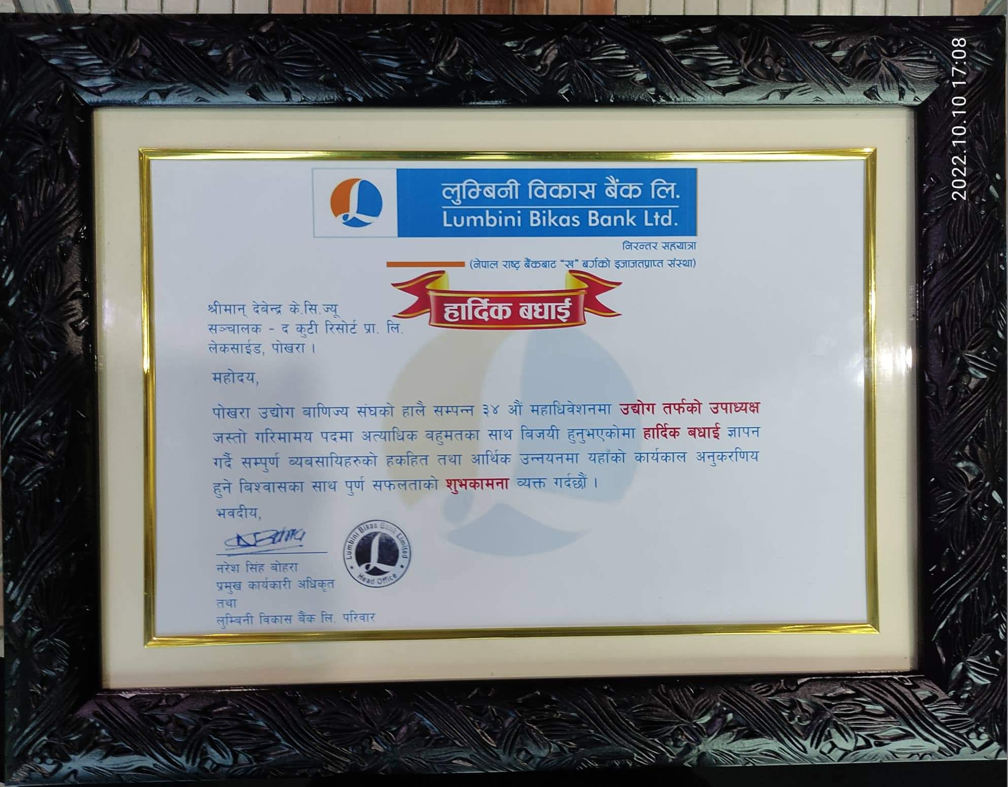 पाेखरा उद्याेग वाणिज्य संघकाे हालै सम्पन्न ३४ आैं अधिवेशनबाट उद्याेग तर्फकाे उपाध्यक्ष पदमा निर्वाचित भएकाेमा उपलक्ष्यमा बैंकले आफ्ना ग्राहक देवेन्द्र के.सी. लाई बधाई तथा शुभकामना ज्ञापन गर्दै प्रमाणपत्रद्वारा सम्मान गरेकाे हाे ।