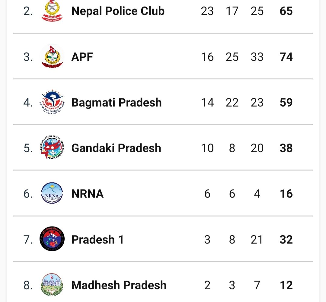 यता एनआरएनएले ६ स्वर्ण, ६ रजत ४ कास्य सहित १६ पदक, प्रदेश १ ले ३ स्वर्ण ८ रजत र २१ कास्य सहित ३२ पदक, मधेश प्रदेशले २ स्वर्ण, ३ रजत र ७ कास्य पदक सहित १२ पदक जितेका छन्।