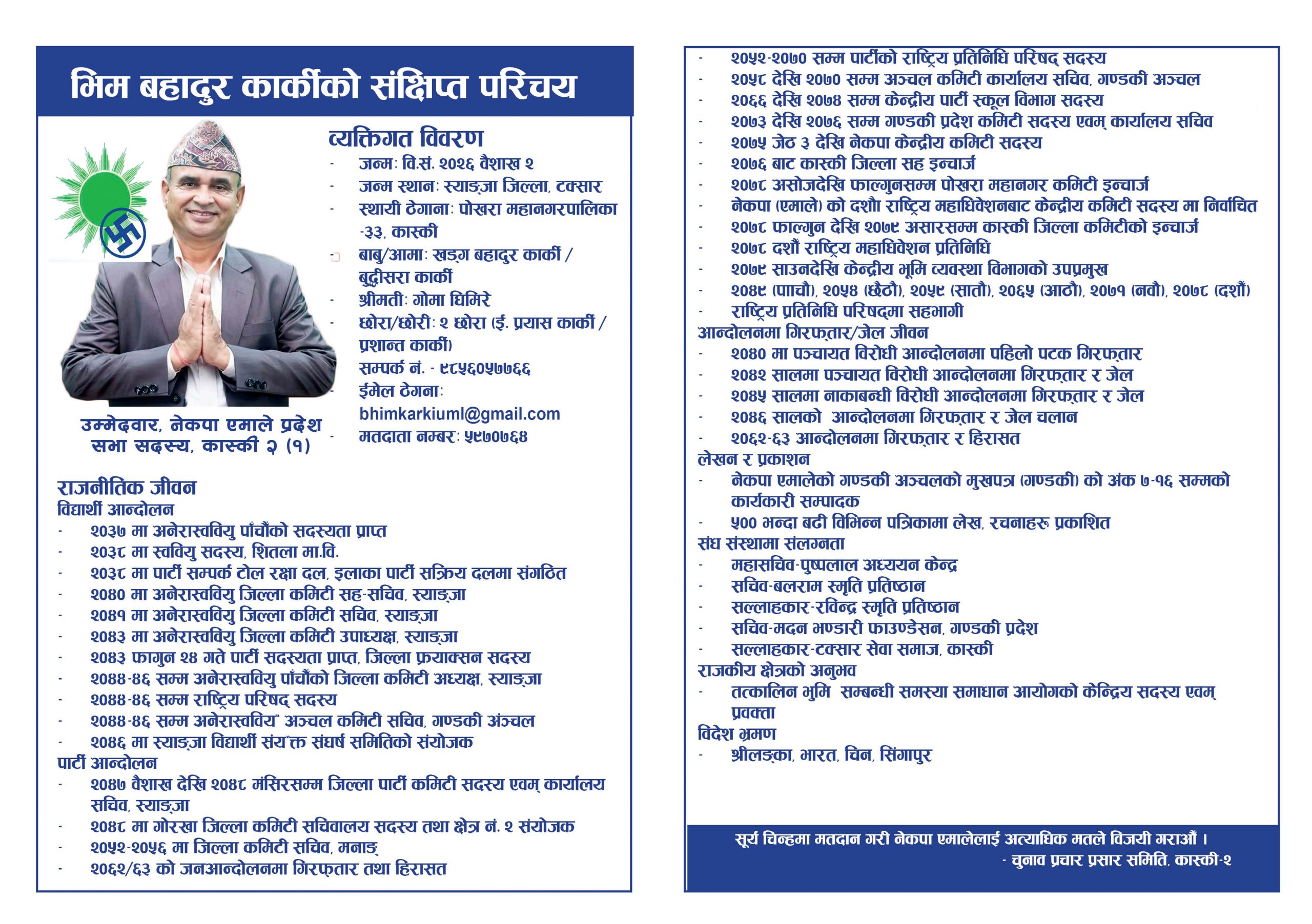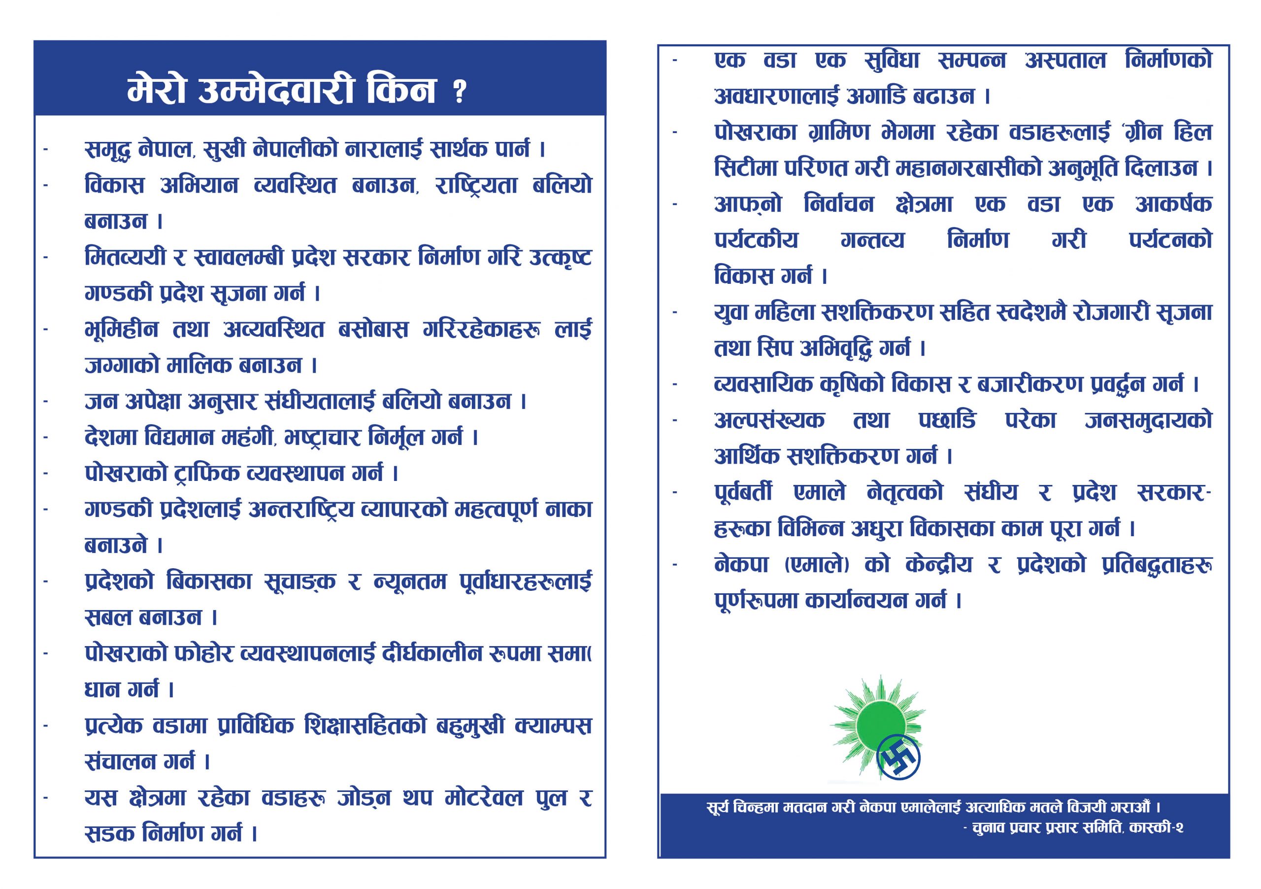 गण्डकी प्रदेश सभा सदस्य पदका लागि नेकपा एमाले कास्की निर्वाचन क्षेत्र नम्वर २ (१) का प्रत्यासी उम्मेदवार भिम बहादुर कार्कीले आफ्नो पाँच वर्षे कार्यकालमा गर्ने विकासका योजना सार्वजनिक गरेका छन् ।