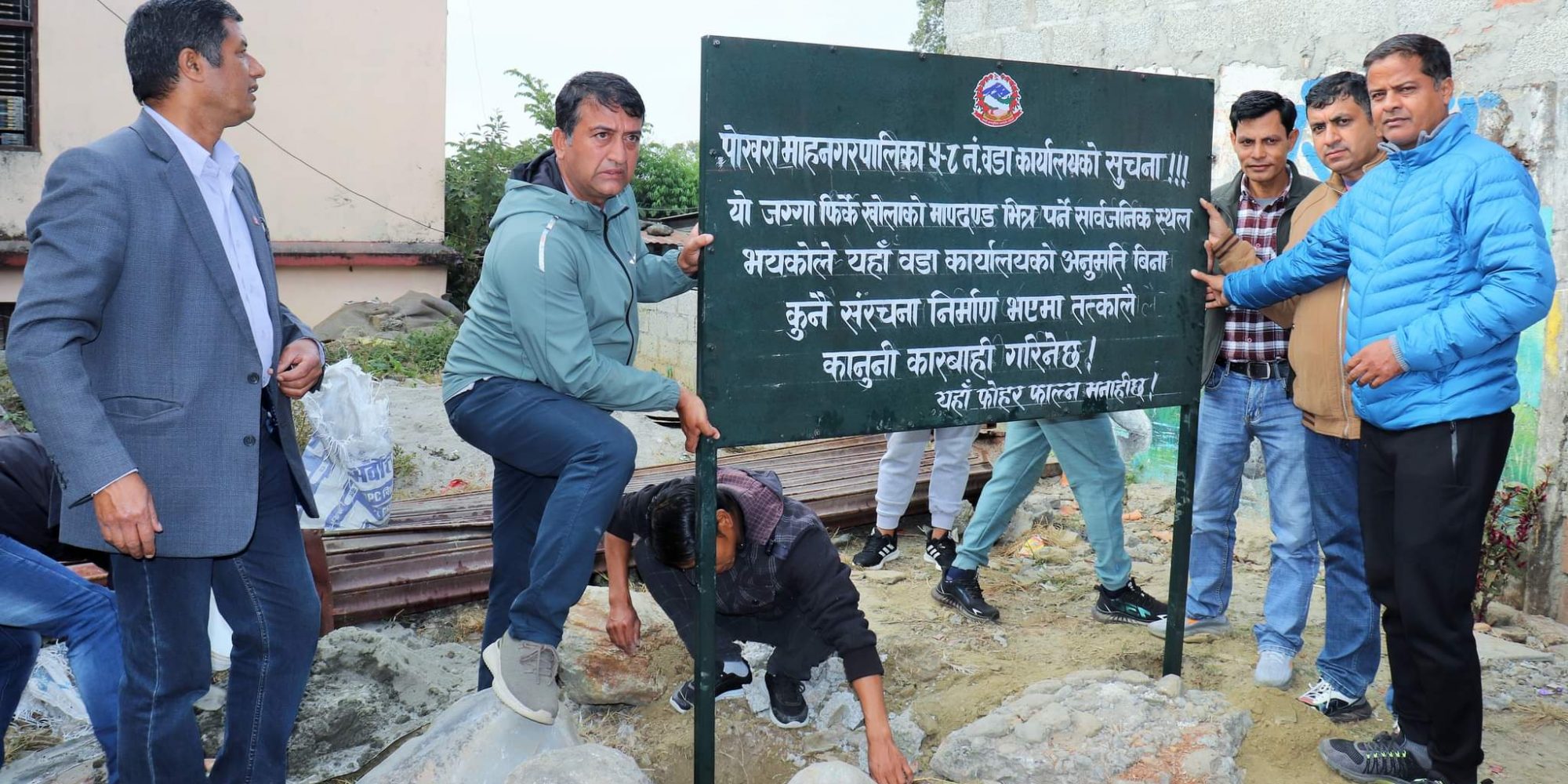 पाेखरा वडा नम्वर ५ का वडाध्यक्ष विष्णुप्रसाद बरालले फिर्के खाेला नजिक जग्गा रहेकाे भनिएका जग्गाधनि विनाेद कुमार भट्टचनले मापदण्ड विपरित पटक पटक अस्थायी संरचना बनाउने प्रयास गरेकाे र पटक पटक सम्झाई बुझाई गर्दा अटेर गरेपछि साेमवार सूचना बाेर्ड नै राखेर सम्वन्धित वडा कार्यालयकाे अनुमति विना संरचना बनाउन राेक लगाएईकाे बताए ।