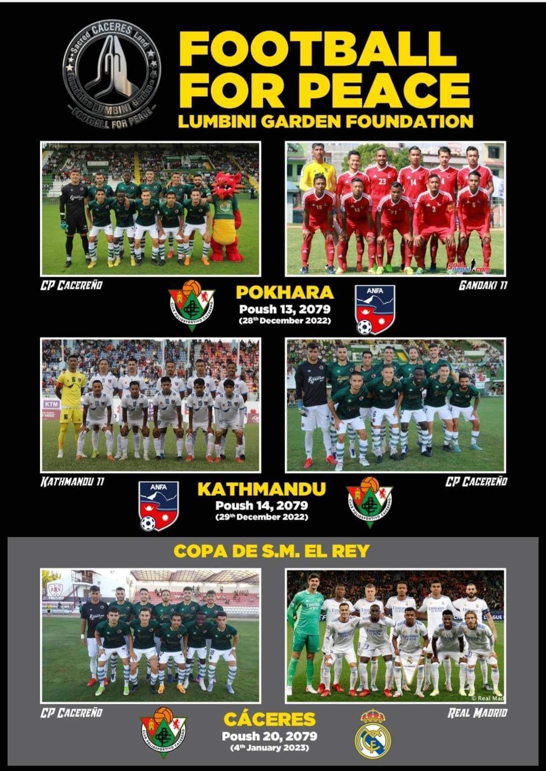 स्पेनको टोलीले पुस १३ गते गण्डकी ११ संग पोखरा रंगशालामा र पुस १४ गते काठमाडौमा मैत्रीपुर्ण फुटबल खेल्ने कार्यक्रम रहेको छ ।