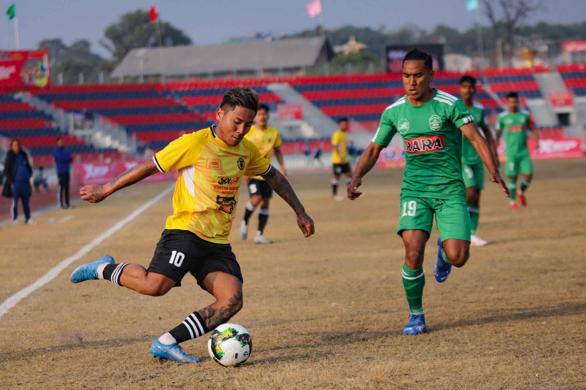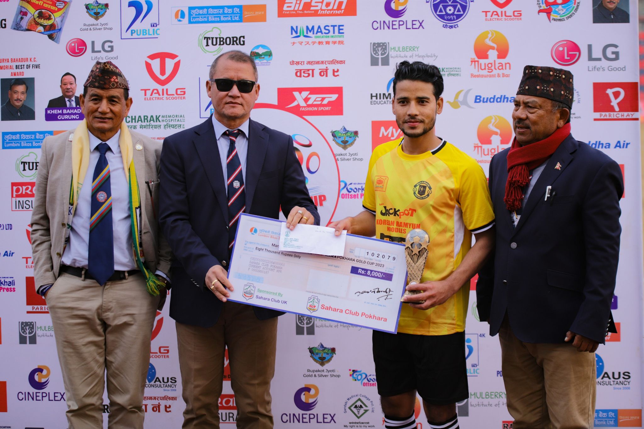 आयोजक सहाराका डिफेन्डर भागवत चौधरीले धरानका प्रकाश बुढाथोकीलाई डिबक्स नजिक व्याड ट्याकल गरे पछि रेफ्री नविन्द्र मर्हजनले फल दिएको थियो । धरानका बुढाथोकीले पाएको उक्त फ्रि किकलाई पहिलो बार च्यापदै हानेको बलले सिधै जाली चुमेको थिए ।
