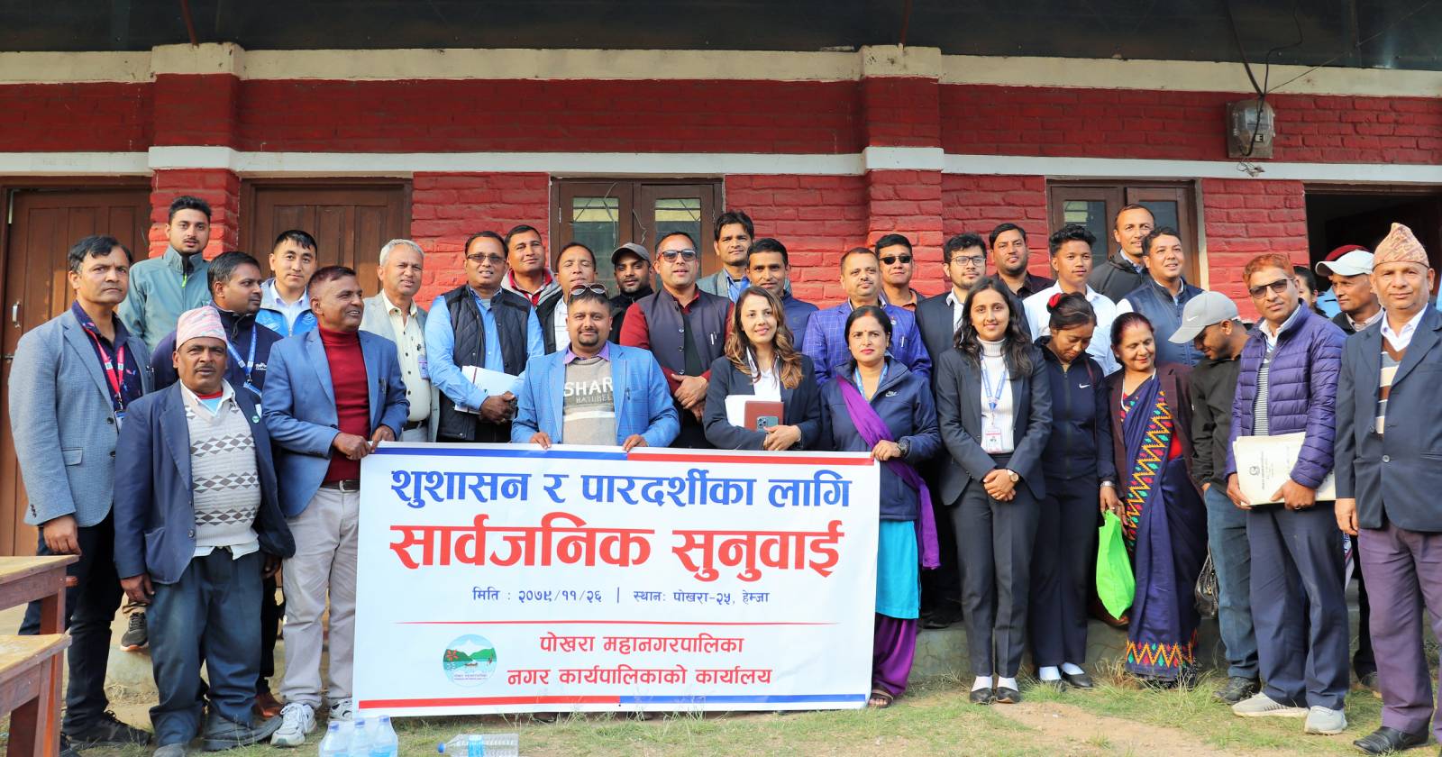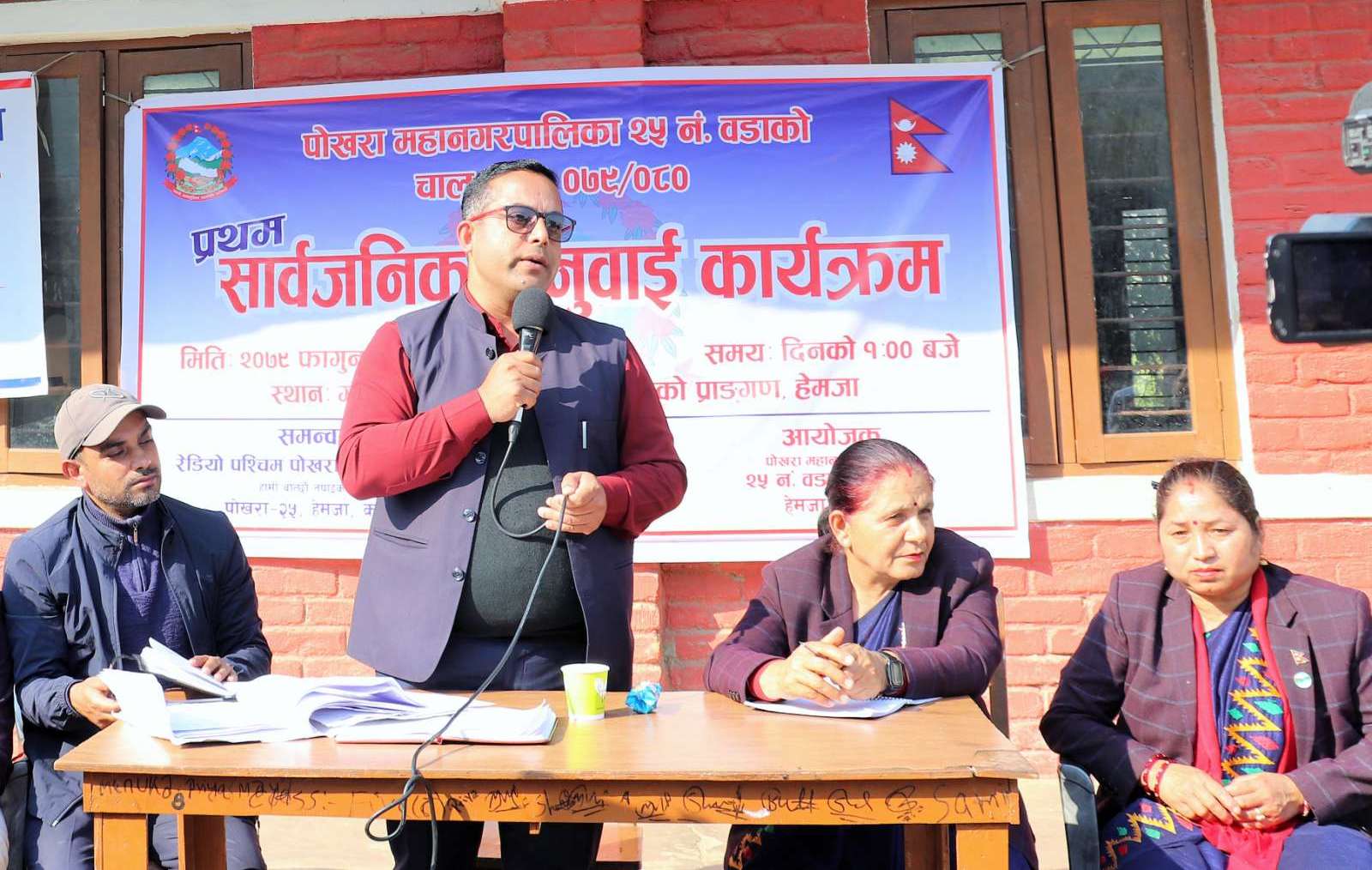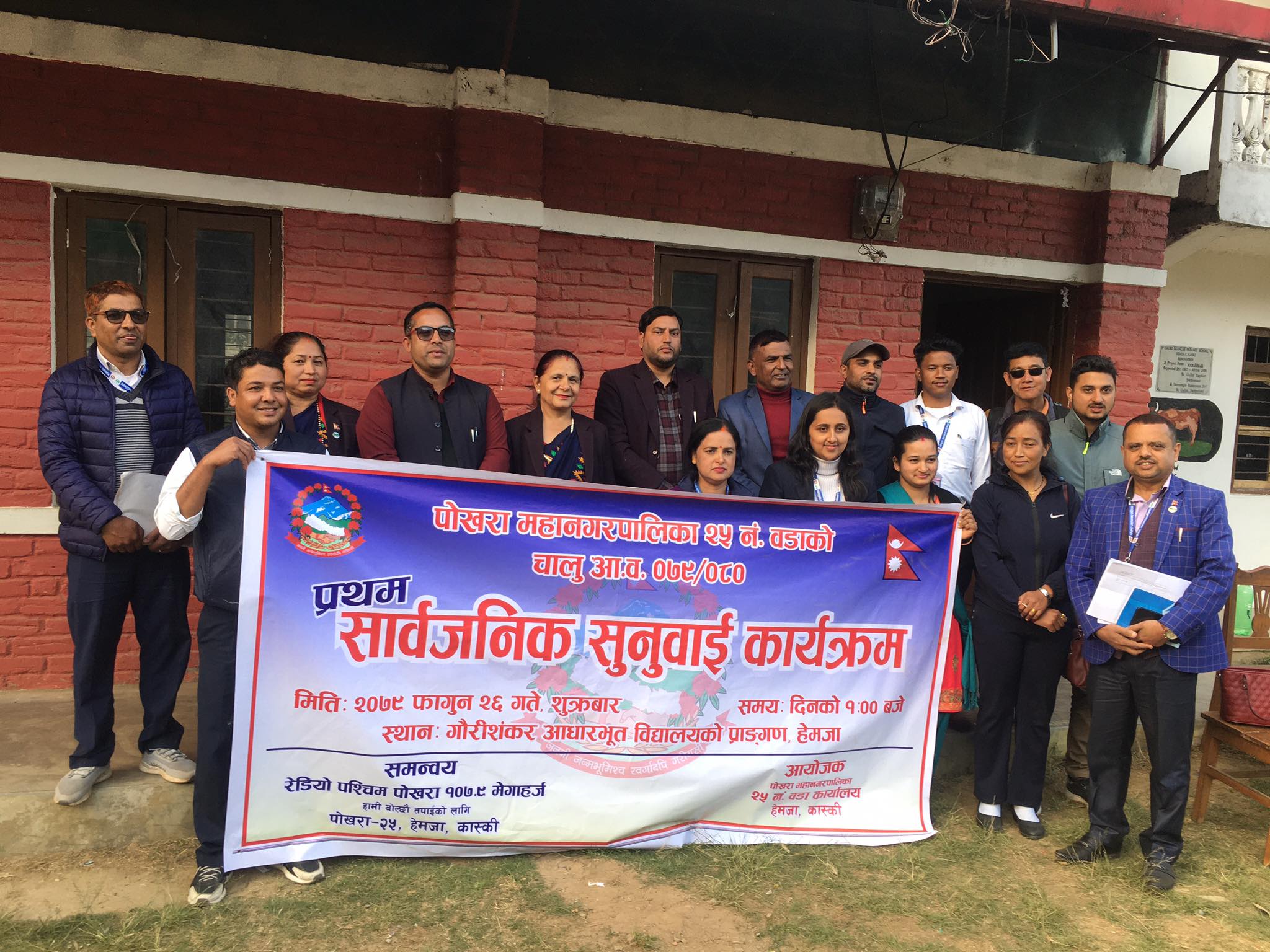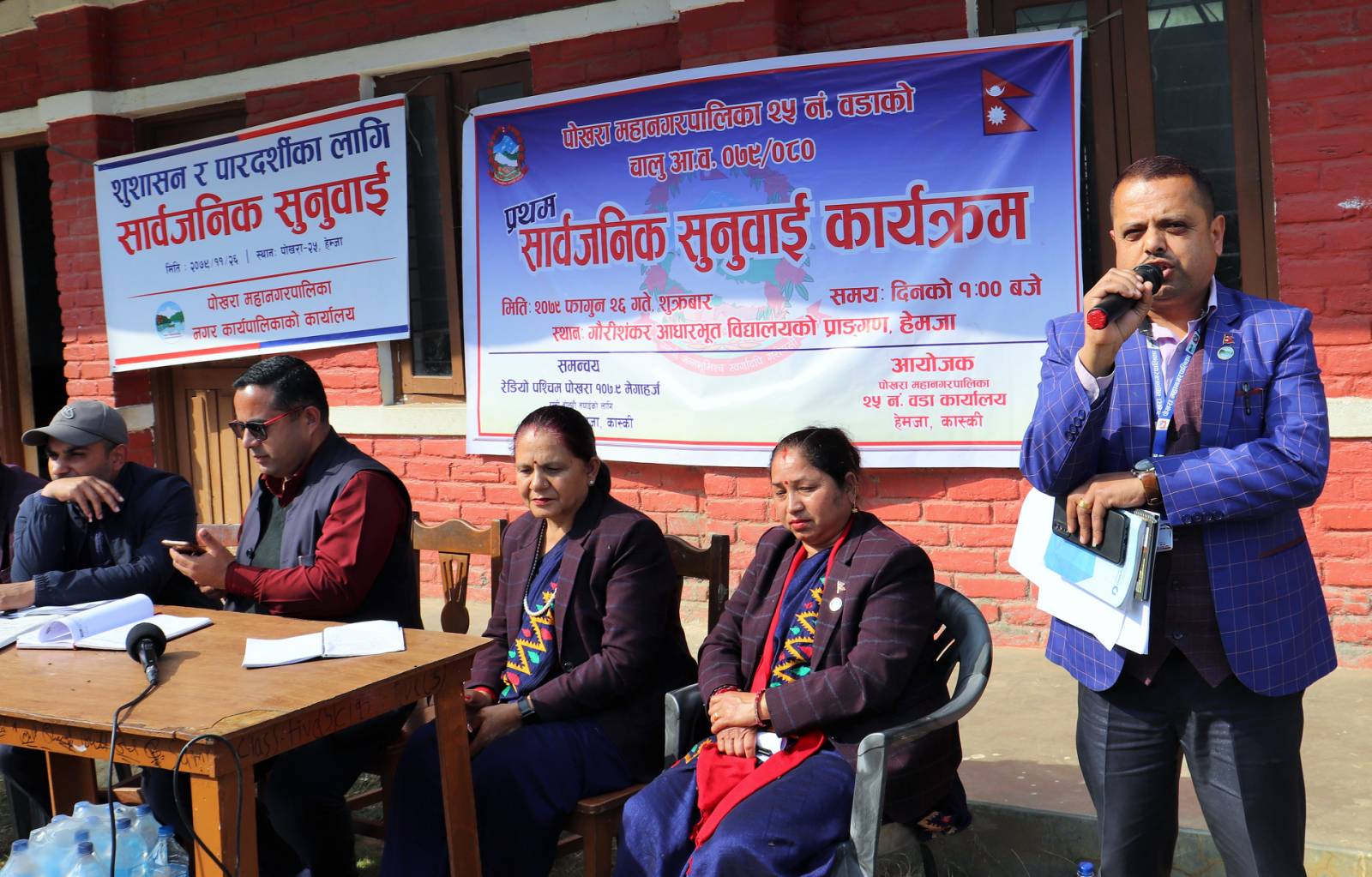 पोखरा महानगरपालिकामा लामो समयको अन्तरालमा सार्वजनिक सुनुवाई भएको छ । शुक्रवार पोखरा महानगरपालिका नगरपालिकाको कार्यालय र पोखरा २५ नम्वर वडा कार्यालयको आयोजना साथै रेडियो पश्चिमपोखरा १०७.९ मेगाहर्जको समन्वयमा पोखरा २५ मा सार्वजनिक सुनुवाई भएको हो ।