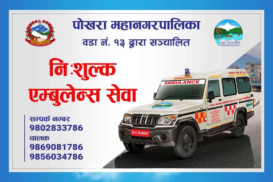 पोखरा महानगरपालिका वडा नम्बर १३ ले निशुल्क एम्बुलेन्स सेवा सुरु गरेको छ । वडाध्यक्ष किरण बरालले विहिबारदेखि निशुल्क एम्बुलेन्स सेवा सुरु गरेका हुन् । वडाका सबै विरामी नागरिकले पोखराका जुनसुकै अस्पतालमा पुग्दा पनि एम्बुलेन्सको भाडा तिर्न नपर्ने बरालले बताए ।
