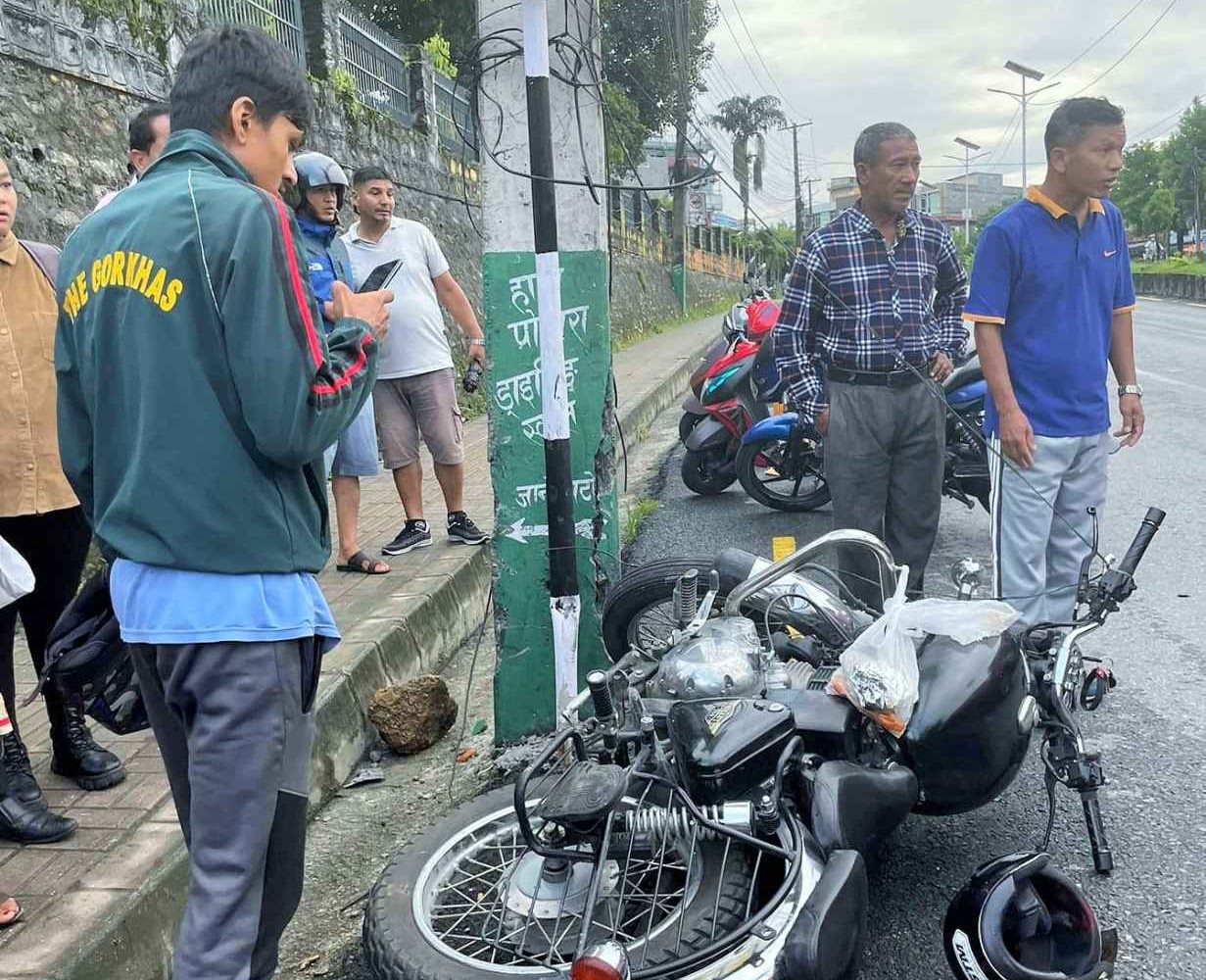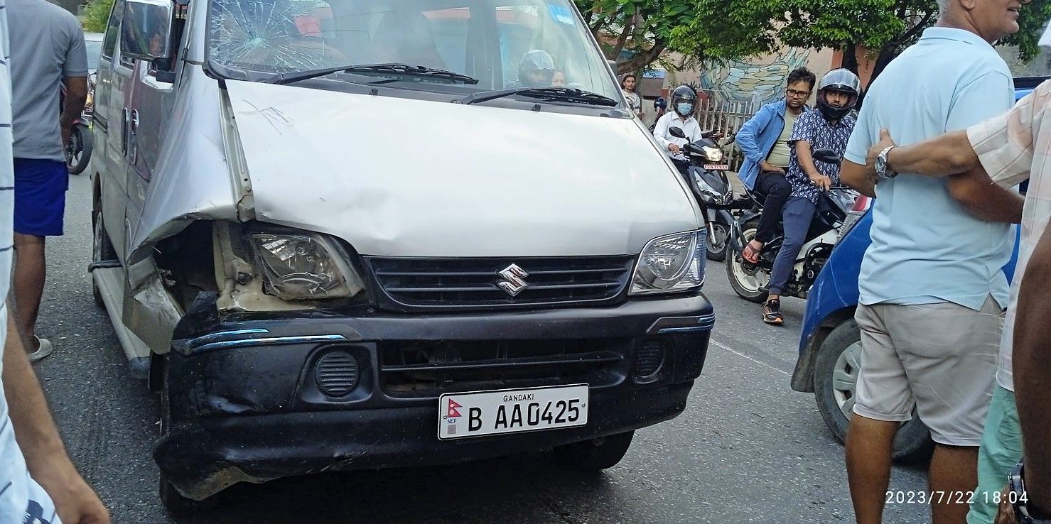 आजै पोखरा २५ हेमजाबाट हरिचोक तर्फ गईरहेकाे ग ५ प ८०२ नम्बरको मोटरसाईकल र सोहि दिशाबाट गुडिरहेकाे ग २३ प ६४८९ नम्बरको स्कुटर एकआपसमा ठोकिएर दुर्घटना भएको छ ।