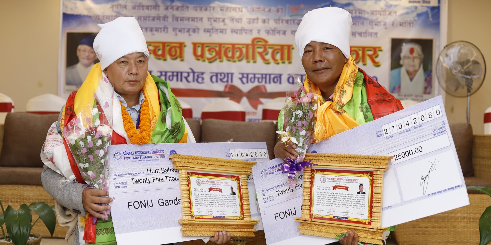 फोनिजको २४ औं स्थापना दिवसको अवसरमा आज (शनिबार) पत्रकार द्वयलाई गण्डकी प्रदेशका मुख्यमन्त्री सुरेन्द्रराज पाण्डे तथा पुरस्कारदाता व्यवसायी विमलमान गुभाजु तथा गुभाजु परिवारले पुरस्कार स्वरुप दोसल्ला, सम्मानपत्रसहित नगद रु २५ हजार अर्पण गरे ।