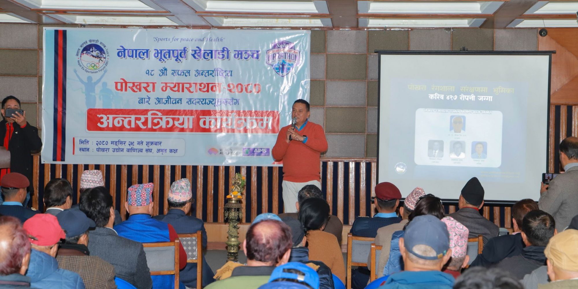 पोखरा । नेपाल भूतपूर्व खेलाडी मञ्चले आफ्ना आजिवन सदस्यहरुसँग अन्तरक्रिया गरेको छ । मञ्चले गर्दै आइरहेको गतिविधि, सफल पोखरा अन्तर्राष्ट्रिय म्याराथन र मृत्यु भएका सदस्यहरुको सम्झना गर्दै अन्तरक्रिया कार्यक्रम सम्पन्न गरेको हो ।