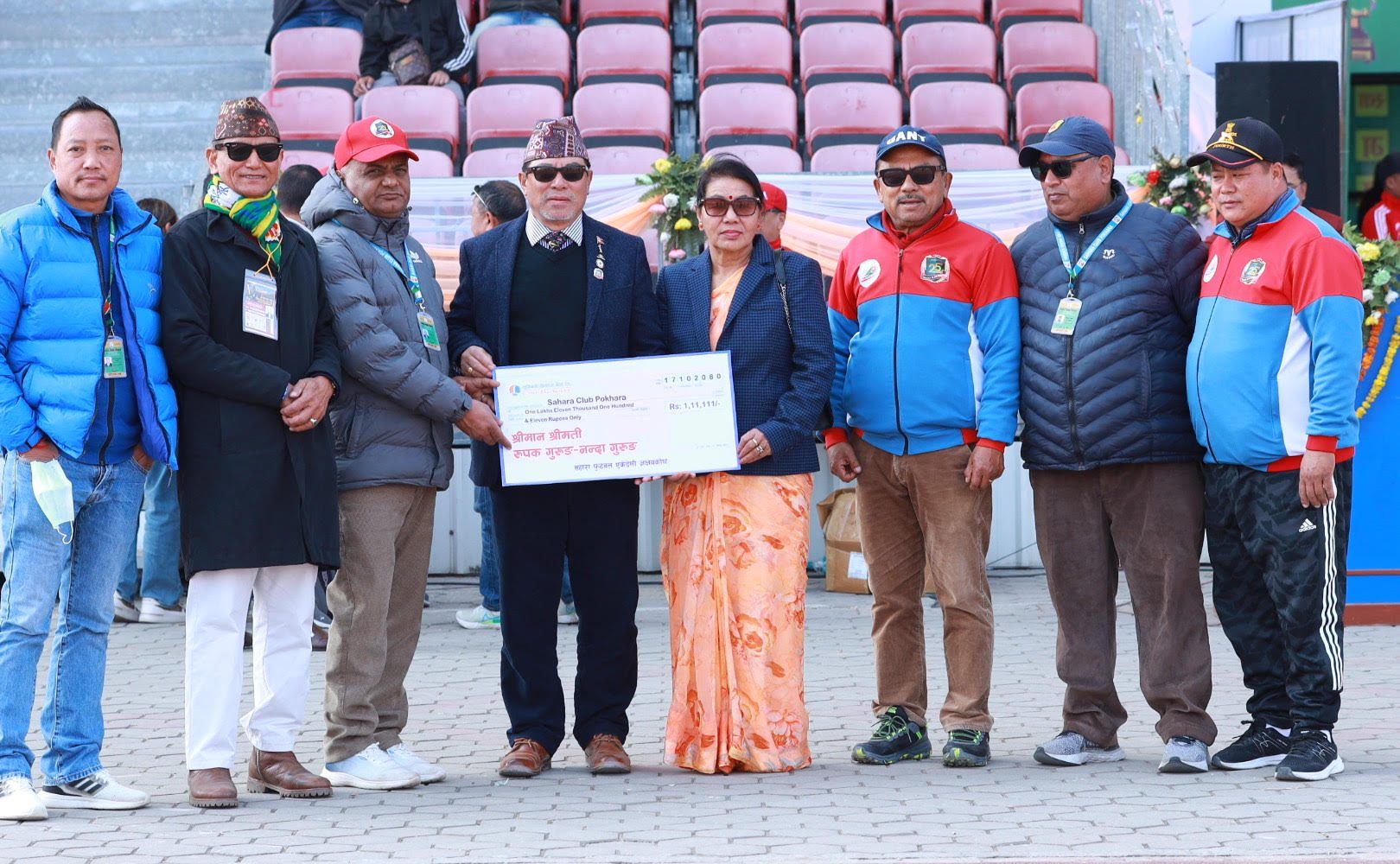 बुधबार भएको २३ औं आहा रारा पोखरा गोल्ड कपको पहिलो सेमिफाइनल खेलको क्रममा पूर्व खेलाडी रुपक तथा नन्दा गुरुङले उक्त रकम बराबरको चेक क्लवका अध्यक्ष केशवराज बराललाई हस्तान्तरण गरेको महासचिव रामजी प्रसाद अधिकारीले बताए ।